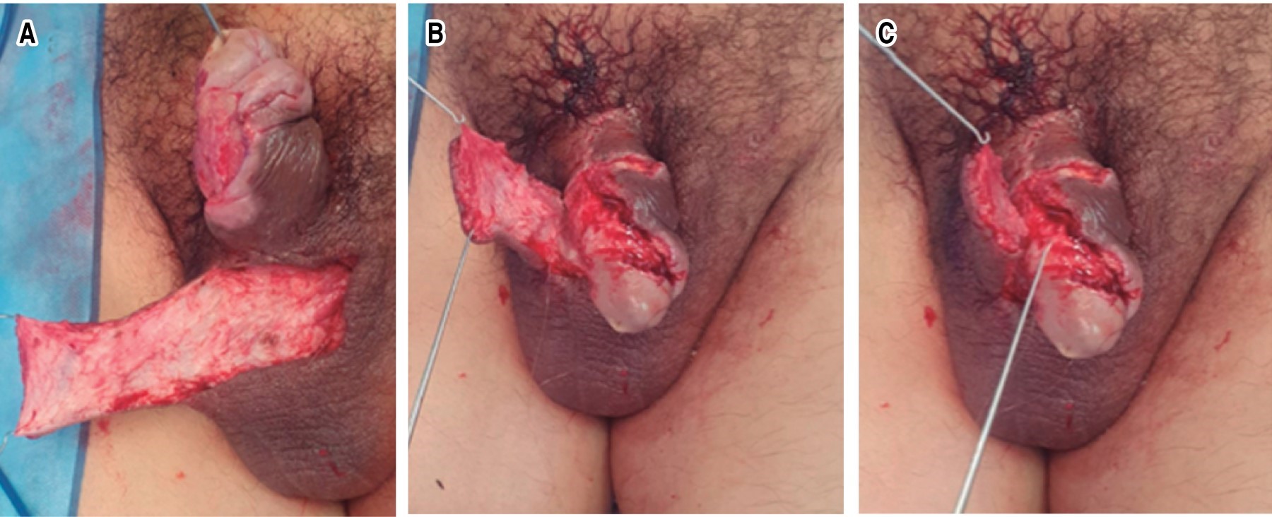 A 19-year-old patient presented with a third-degree scald burn on the skin of the penile shaft. Physical examination revealed necrosis of the skin of the penile shaft, with no signs of hematuria or difficulty urinating. Debridement of the necrotic tissues was performed, presenting a cutaneous loss of the penile shaft, leaving the tunica albuginea and glans intact. In this case, the inner skin of the foreskin was preserved, and a full-thickness skin graft with fenestrations was performed to cover the defect immediately after debridement; the donor site was the left groin, which was managed with a primary closure. The patient had an uneventful postoperative course. A follow-up examination showed an integrated and sufficiently mobile skin graft with great flexibility (Figure 1).