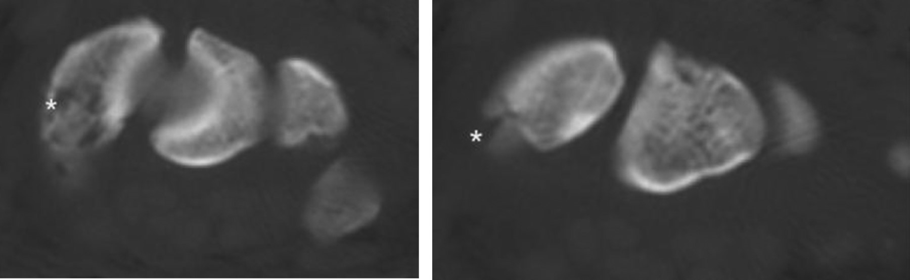As a consequence of the high failure treatment rate, the altered kinematics associated with scaphoid nonunion have been explored. Considering the scaphoid dorsal apex (most dorsal region) we can classify distal nonunions as a mobile type, more associated with DISI and with greater nonunion mobility at wrist mobilization; while the proximal ones, as in the patient we report, as a stable type, without deformity development, dorsal lunate instability and with less nonunion gap mobility at wrist mobilization.19 A positive correlation between DISI deformity and a larger nonunion gap in the focus of nonunion has been identified.18