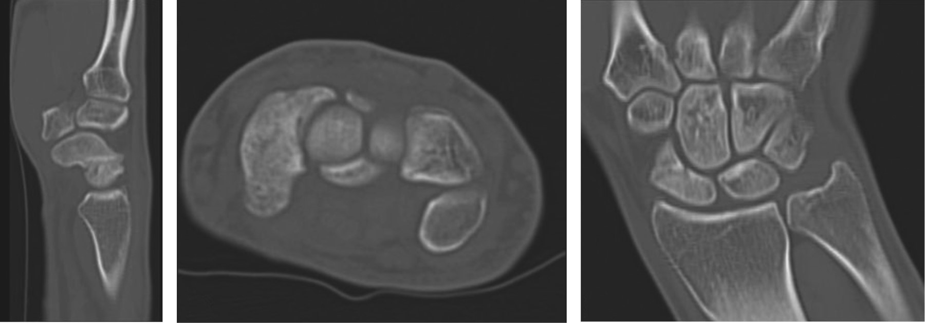 A 28-year-old right-handed male, with no comorbidities, sustained a wrist injury when he fell from his own height and landed with an outstretched right hand. He evolved with swelling, limitation of movement, and tenderness on palpation in his anatomical snuff box. He was initially assessed in another institution where through plain radiographs the diagnosis of scaphoid fracture was made. It was classified as a Herbert and Fischer type B2 (complete displaced scaphoid waist fracture) (Figure 1). Consequently, he was immobilized with a below-elbow cast without the inclusion of the proximal phalanx of the thumb. After three weeks, the patient removed his cast and decided to abandon the treatment and medical follow-up. At seven months he consulted again for pain. Once more, posteroanterior, lateral, and scaphoid (30° wrist extension, 20° ulnar deviation) plain radiographs of the wrist were requested (Figure 2). The fracture exhibited absence of consolidation. Due to the evolution time (more than six months from the initial trauma), a scaphoid nonunion was diagnosed. A CT scan was requested to assess displacement. This revealed a Herbert type D nonunion (established nonunion), with no density alteration in the scaphoid fragments and no displacement (Figure 3). According to the Slade and Geissler classification, it was a grade II nonunion, with no sclerosis, no bone cysts, and a small resorption edge. Surgical treatment was indicated, but the patient refused. Then he returned to our institution 10 months after the initial injury. He presented with pain in the anatomical snuffbox, on axial compression of the first metacarpal, and on palpation of the scaphoid tubercle. Mobility was similar to the contralateral side but painful (visual analogue scale [VAS] 7/10) (Table 1). Surgical treatment was once more indicated. The patient was then lost in follow-up and returned to control 15 months after the initial injury without having undergone any type of treatment or immobilization. He showed a spontaneous clinical improvement, a complete absence of pain (VAS 0/10) and range of motion, and grip strength similar to the healthy contralateral side (Table 1). Plain radiographs and CT scan with 3D reconstruction were requested. The new images showed scaphoid consolidation (Figures 4 and 5).
