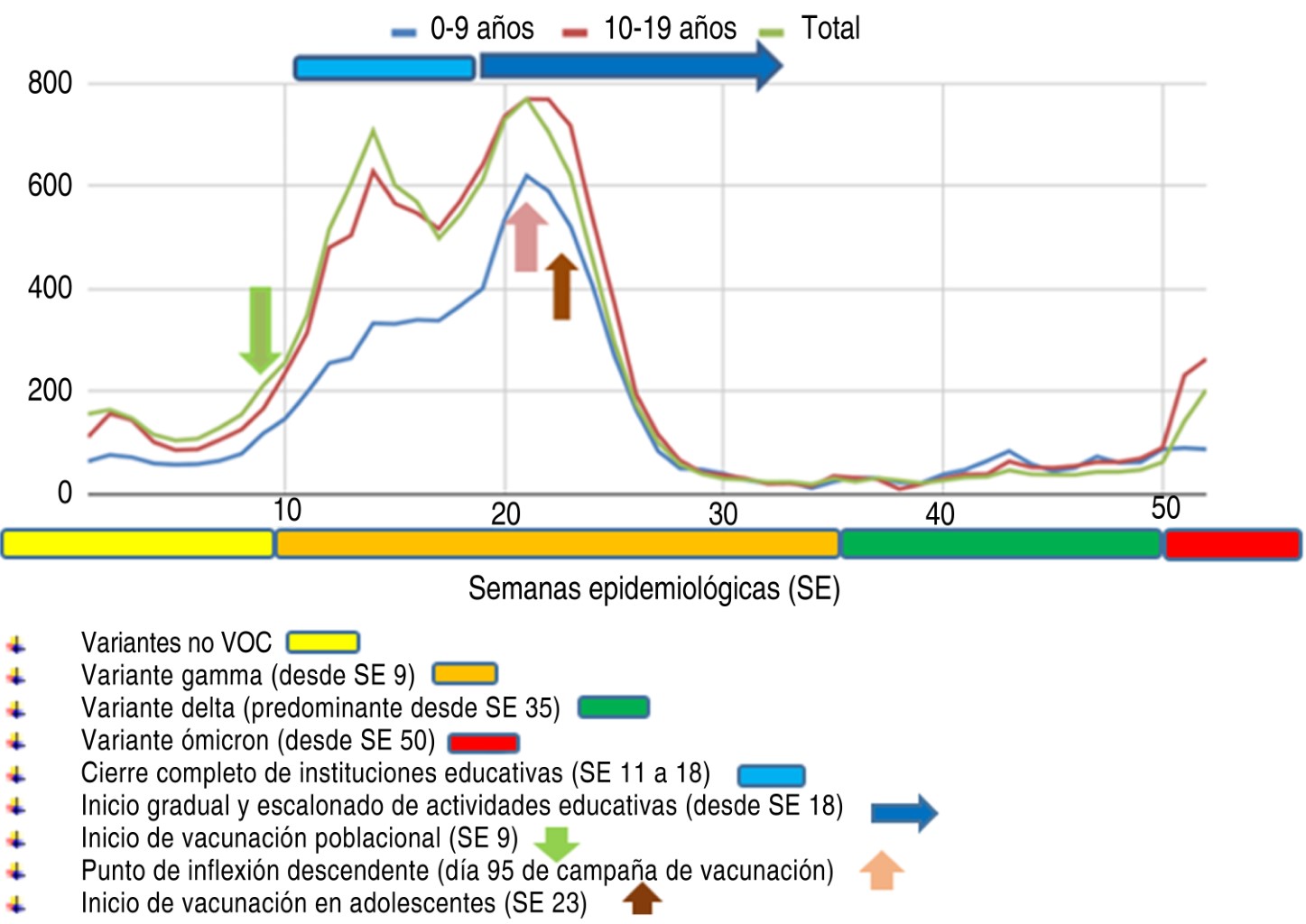 Conclusions: the epidemic in children and adolescents reflects that of TP, with a significant increase due to Vγ admission and a significant decrease due to PV with high coverage. PV was highly effective in reducing cases, ICU admissions, and deaths. The suspension of face-to-face education did not impact the incidence.
