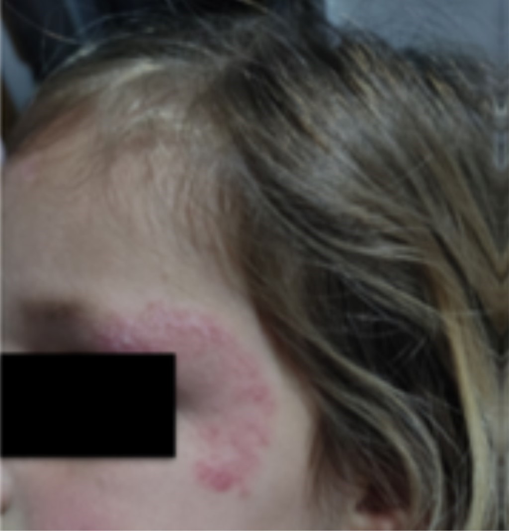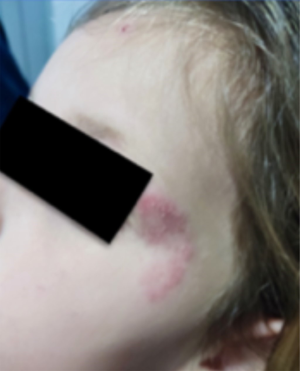 A 4-year-old patient who attended the pediatric clinic for presenting a 2-week-old skin lesion in the periorbital region with an erythematous-scaly appearance. Initially, he received treatment with topical corticosteroids and antibiotics. One week later, in the absence of improvement and the appearance of an erythematous border with a clear center, a fungal infection is suspected, and the family confirms contact with a domestic guinea pig, for which a smear of the lesion is performed and the treatment regimen is modified to topic clotrimazole. Two weeks later, growth of T. benhamiae was confirmed, for which reason the treatment was modified, starting oral and topical terbinafine for 6 weeks, with resolution of the lesion. Importance of the case: Trichophyton rubrum, Trichophyton mentagrophytes and Microsporum canis are the fungi that most frequently cause dermatophytosis. The dermatophyte detected in the lesion of this case, T. benhamiae, although less common, has an increasing prevalence in our environment, and requires prolonged treatment and follow-up.