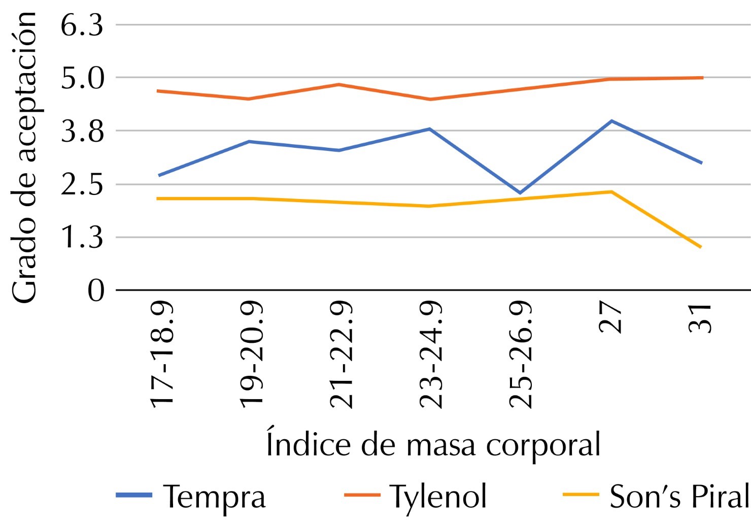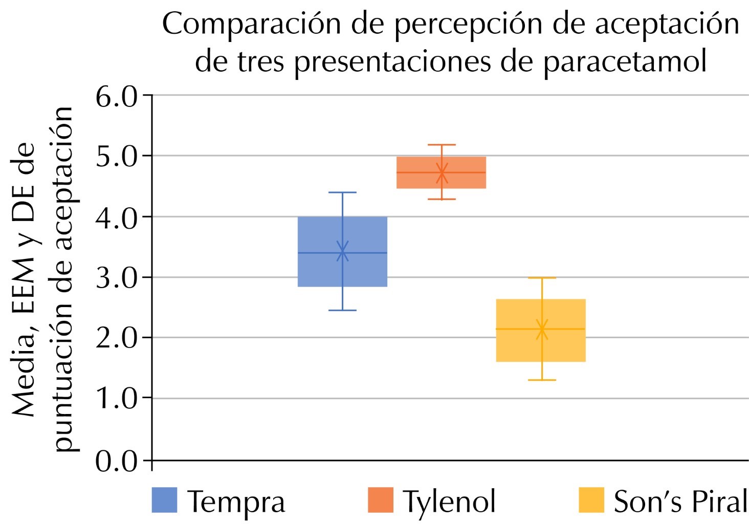 Results: an overall score of 3.43 ± 0.97 (range 1 to 5) was obtained for Tempra, 4.72 ± 0.45 (range 4 to 5) for Tylenol and 2.13 ± 0.85 (range 1 to 5) for Son's Piral, finding statistically significant differences globally and between each of the drug presentations (p < 0.00001).
