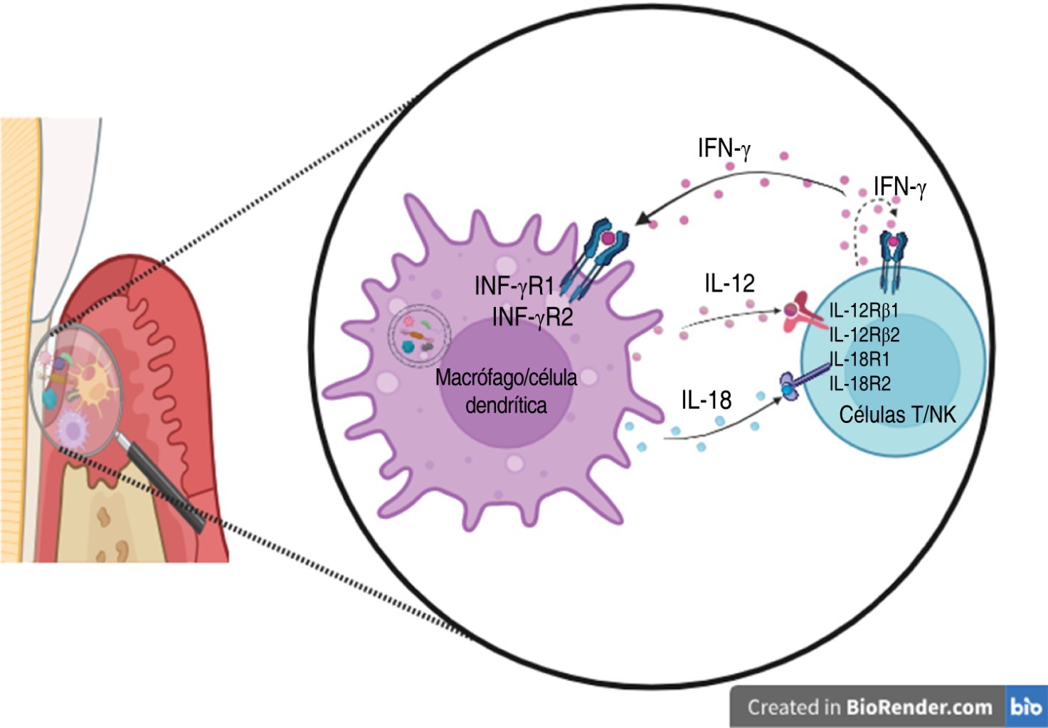 Introduction: periodontitis is a chronic immuno-inflammatory disease caused by bacterial dysbiosis, which leads to the destruction of periodontal tissues. It has been proposed that IL-12, IL-18 and IFN-γ are involved in the immune response in periodontitis. In this sense, discrepant results of these cytokines have been found in various biological samples from patients with periodontitis. Likewise, a strong expression of the IFN-γ receptor has been observed. However, the expression of IL-12R and IL-18R in periodontitis has not been studied.