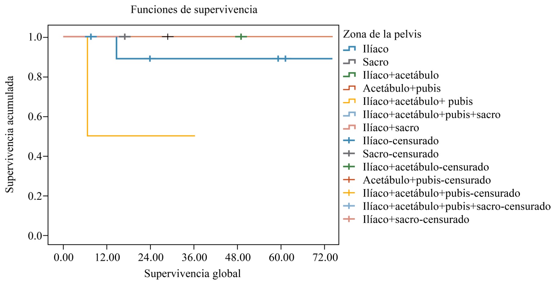Material and methods: a retrospective database cohort with prospective follow-up of sarcomas in patients diagnosed with primary pelvic chondrosarcoma who underwent surgical treatment. Clinical-demographic variables were obtained, a descriptive analysis of each variable was performed, and these were contrasted with the outcome variables.