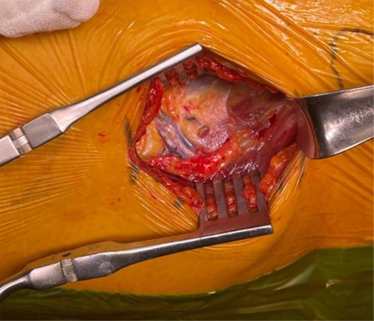 The ascending branches of the lateral femoral circumflex arteries are exposed during the standard exposure for THA with the DAA (Figure 2). These vessels are located below the TFL's deep fascial layer, so it is essential to dissect it carefully, using a blunt dissector, for example. Inadequate identification ligation and coagulation of these bundles can result in significant bleeding during and after the procedure. These vessels consist of a variable-length leash of vessels and are typically visible in the center of the incision. Usually, ligatures and routine electrocauterization are sufficient to prevent and stop the bleeding from these vessels. An increased risk of postoperative hematoma development can result from inadequate hemostasis.11