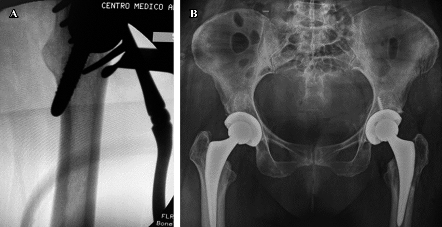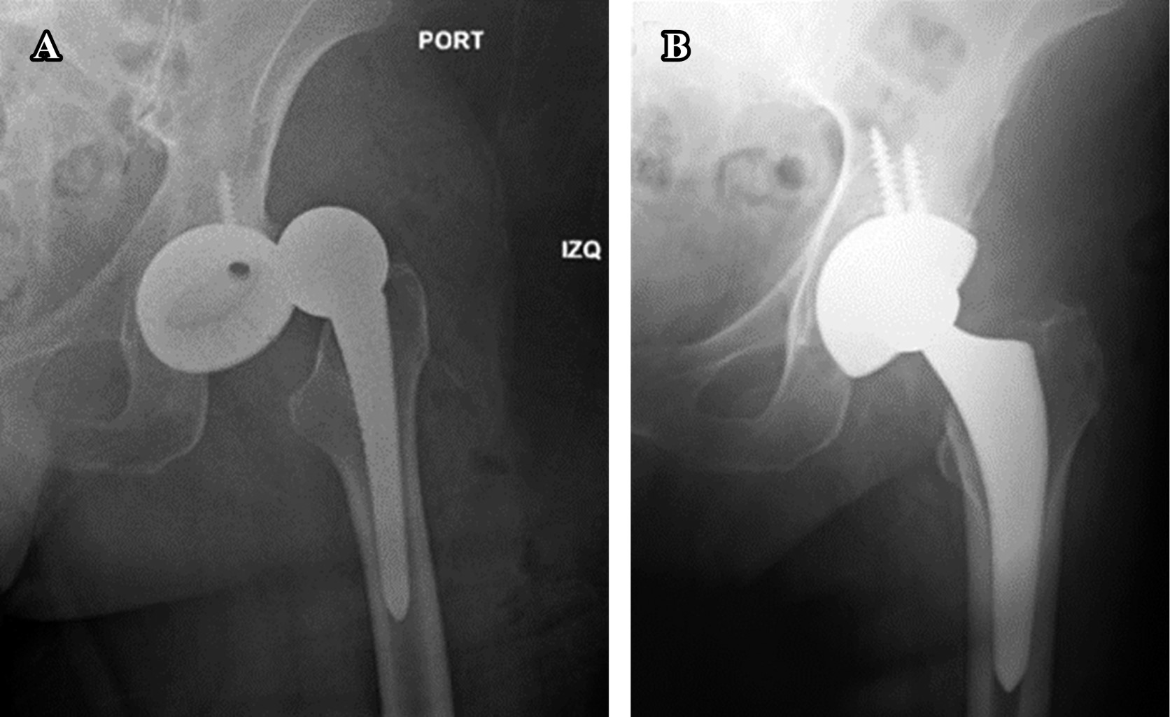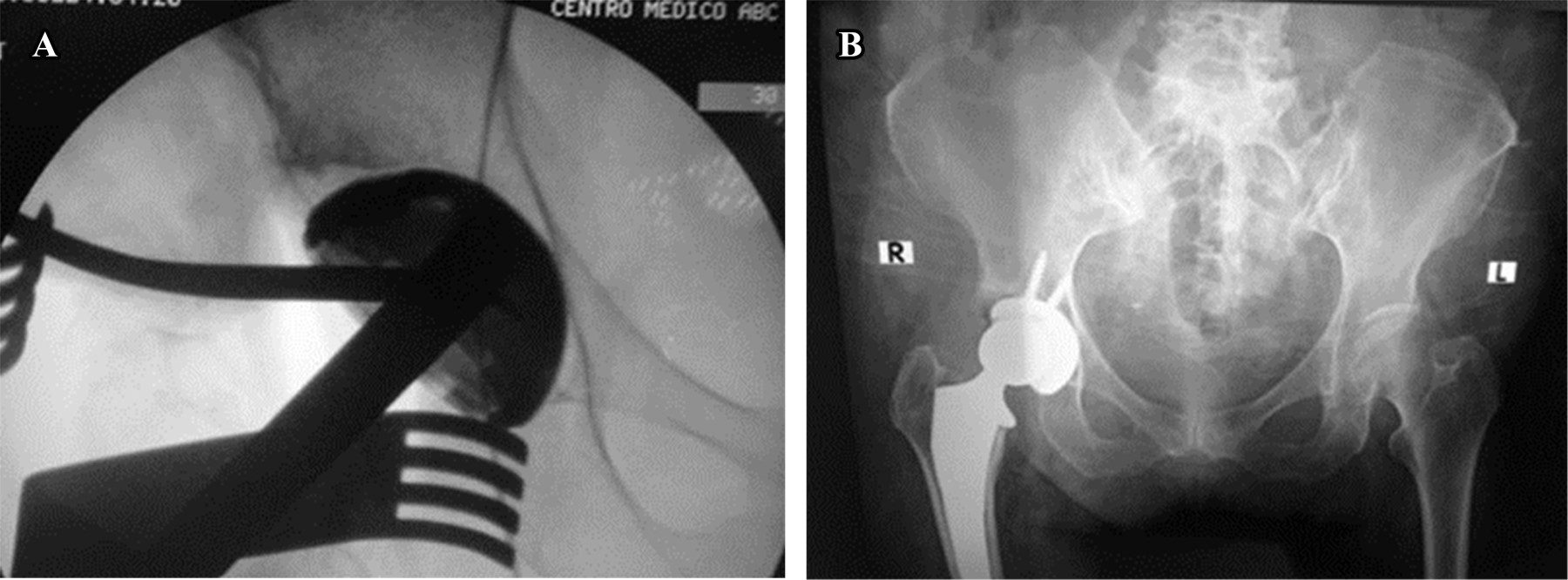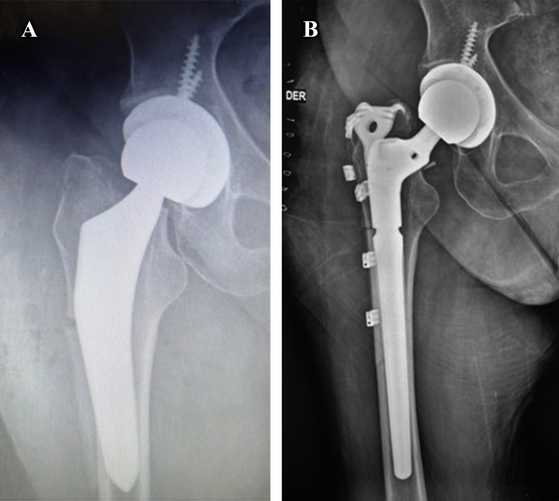 Postoperative fractures can result from direct trauma and should be treated according to the classification and management of periprosthetic fracture protocols. Some non-identified fractures could be produced during the procedure and present in the former days as complex, unstable fractures with stem compromise, minor or severe subsidence that could need former revision and stem removal and exchange (Figure 8).