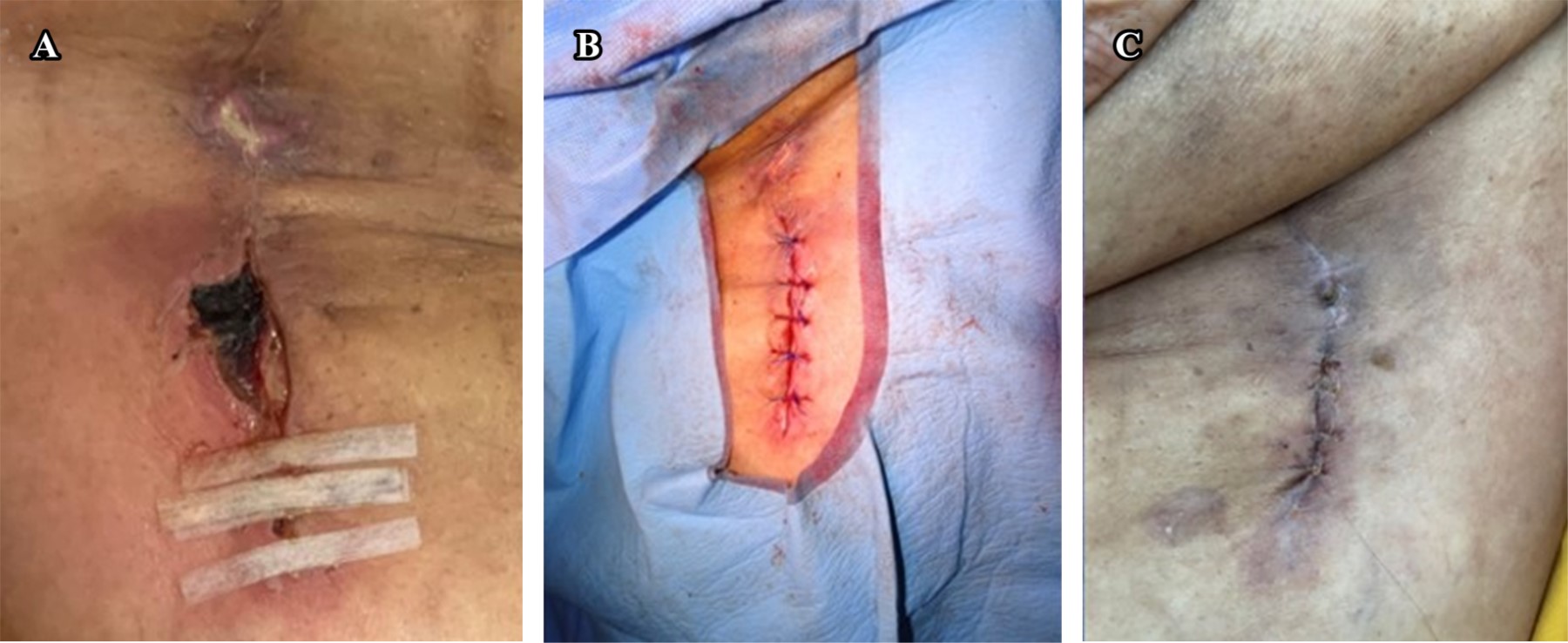 In some cases, an infection could be related as part of the wound complications, and in very few cases, surgical management is required. Periprosthetic infection is a catastrophic complication. It should be resolved according to standard protocols depending on the presentation and diagnosis, often requiring surgical management with implant retention or exchange in one or two stages. Wound problems are one of the most common complications related to the anterior approach, and superficial wound breakdown can occur early in the postoperative period (Figure 7). Meticulous care should be taken with hemostasis at the end of the procedure because the only formally closed layer is the superficial fascia of the TFL. We use continuous absorbable sutures to ensure a good seal after any bleeders are coagulated.