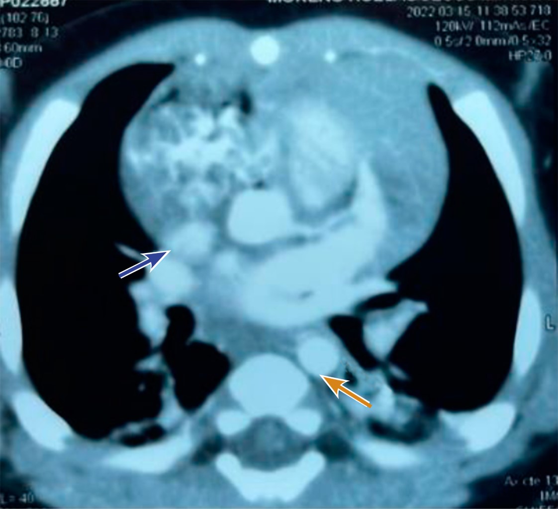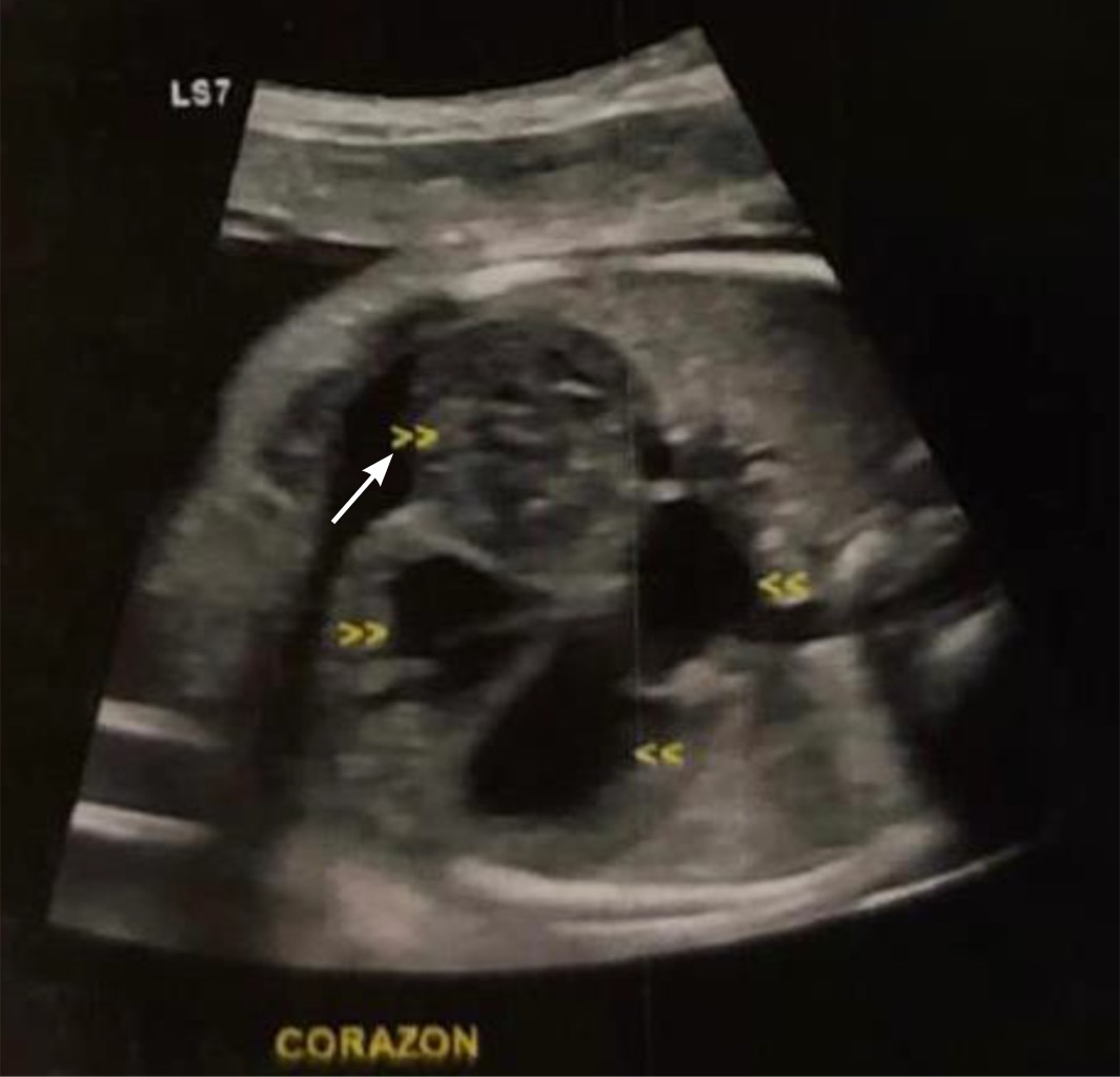 Case presentation: three-month-old male patient who had an intrauterine diagnosis of mediastinal mass. At birth he was asymptomatic. Resection of right atrial tumor was performed. The pathology report indicated that it was an intracardiac hemangioma. The patient has had a favorable evolution.