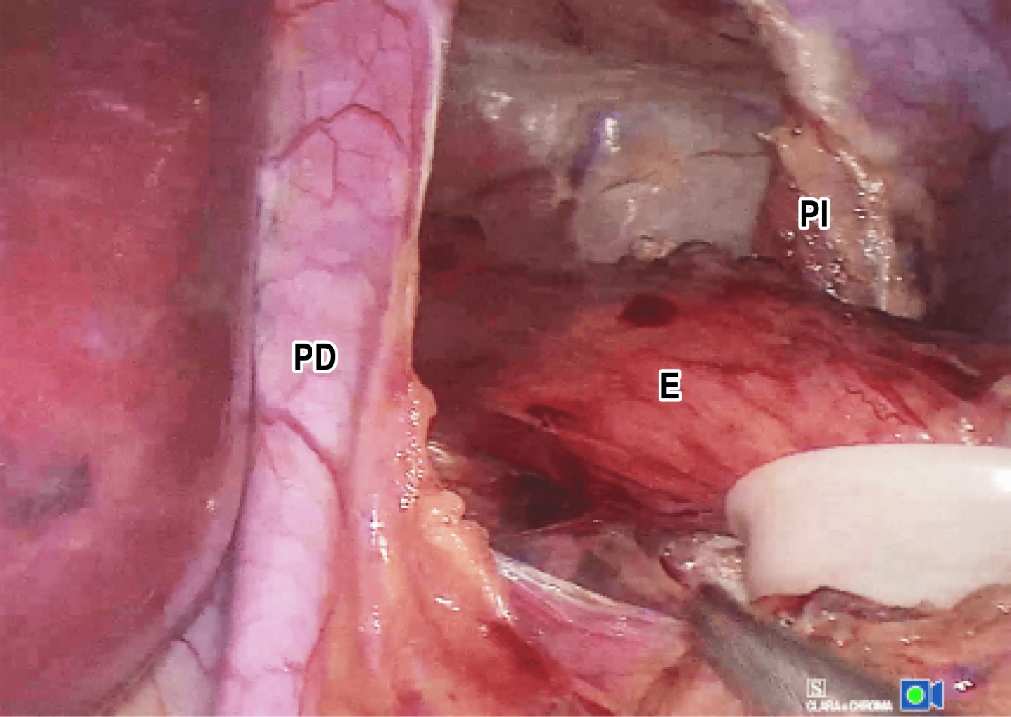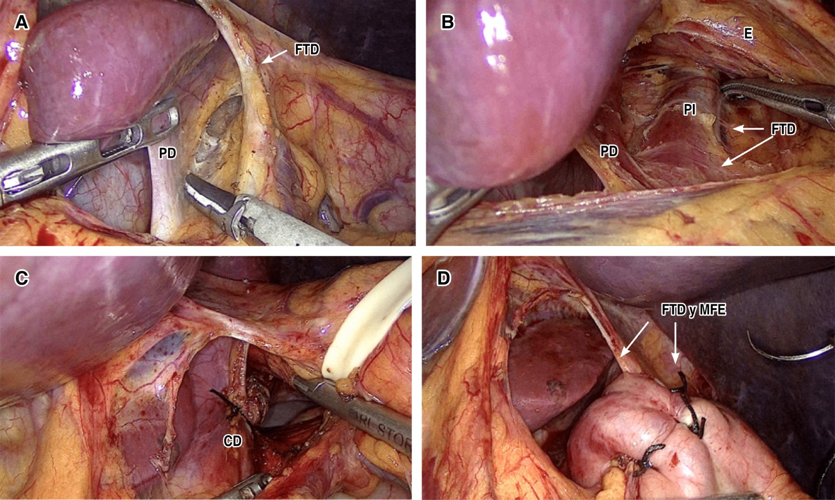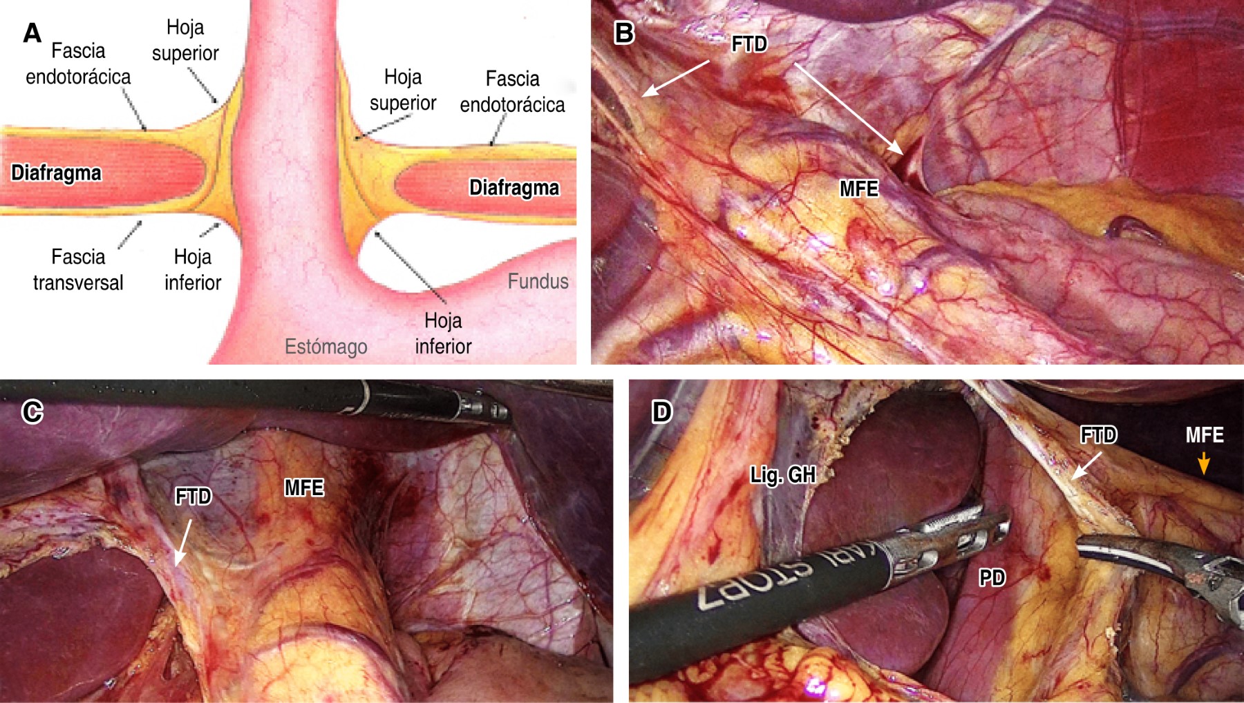 Introduction and objectives: laparoscopic fundoplication involves the dissection of the phrenoesophageal membrane (PEM) and the diaphragmatic transversalis fascia (DTF). We propose modifying this technique by preserving the anatomical structures involved in esophageal fixation to reduce surgical trauma, decrease postoperative pain, dyspeptic syndrome and dysphagia, and evaluate the main outcomes of this technique. Material and methods: a comparative, prospective, observational study was conducted in a private hospital in Mexico City from August 2018 to January 2022, including patients diagnosed with gastroesophageal reflux disease (GERD) due to lower esophageal sphincter (LES) incompetence or hiatal hernia confirmed by endoscopic, radiological, and manometric evaluation. These patients were treated with a modified laparoscopic Nissen procedure that preserved the PEM and DTF and were followed up for one year. The following variables were considered: gender, age, weight, number of surgical sutures in fundoplication, hernia size in centimeters, bleeding, surgical time, comorbidities, ligation of short vessels, length of hospital stay, postoperative pain, and postoperative dysphagia. Results: during the study, 45 patients underwent laparoscopic fundoplication. In 24 patients, the PEM and DTF were preserved, forming the study group. All of these patients had type I hiatal hernia with LES incompetence. The remaining 21 patients did not have the membrane preserved. All patients showed significant improvement in terms of postoperative pain and dysphagia. Conclusions: preservation of the PEM and DTF is a technically feasible and safe modification of the Nissen procedure for type I hiatal hernia, with good results.REFERENCES