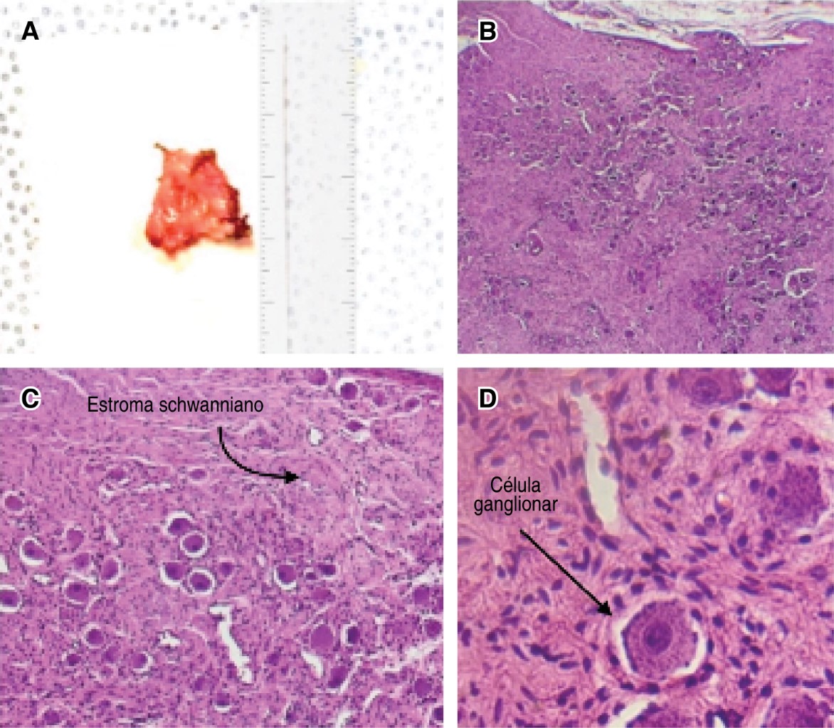 Conclusion: complete resection by laparoscopy is widely accepted as an adequate therapy without recurrence for the treatment of symptomatic retroperitoneal ganglioneuromas such as the clinical case reported, presenting a good prognosis.