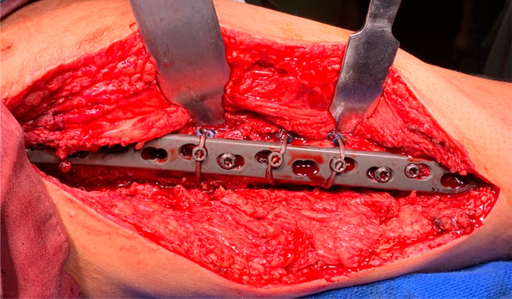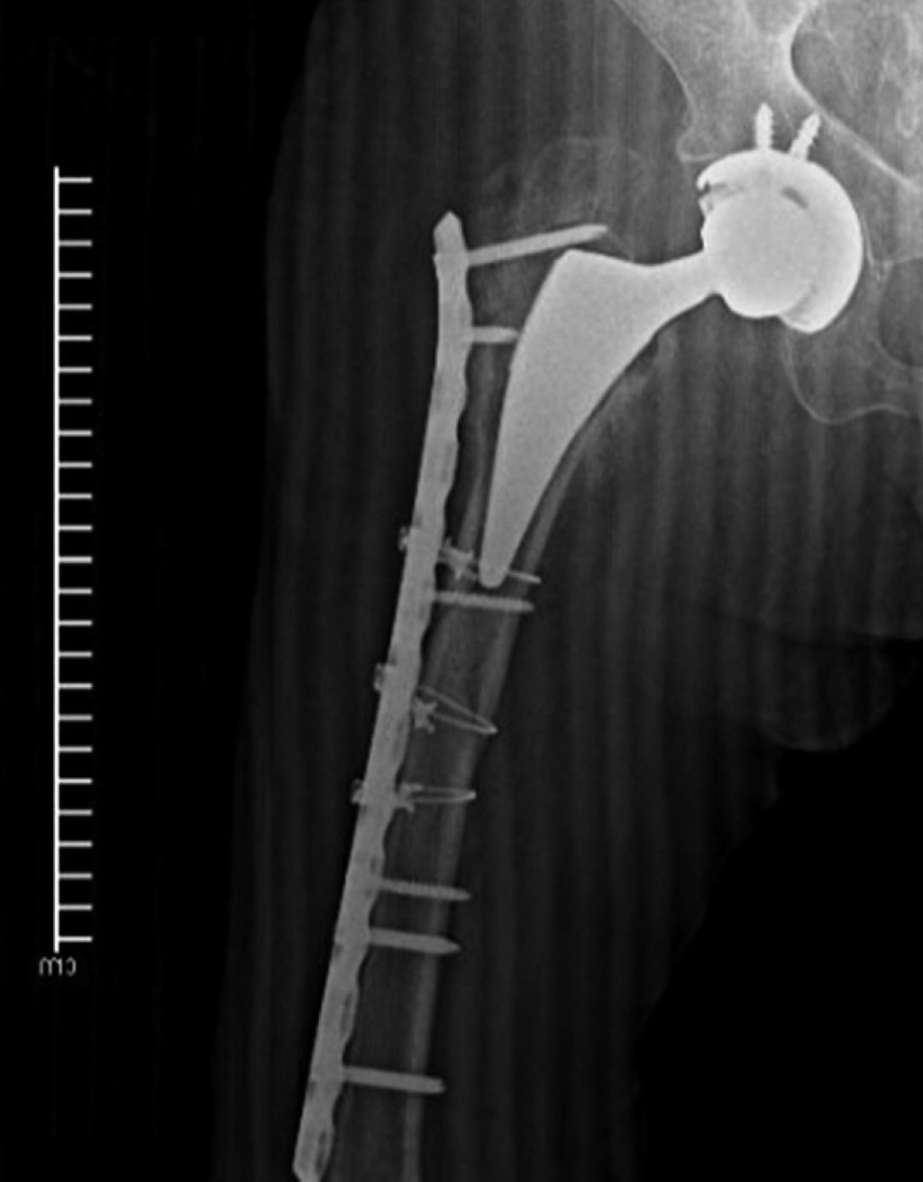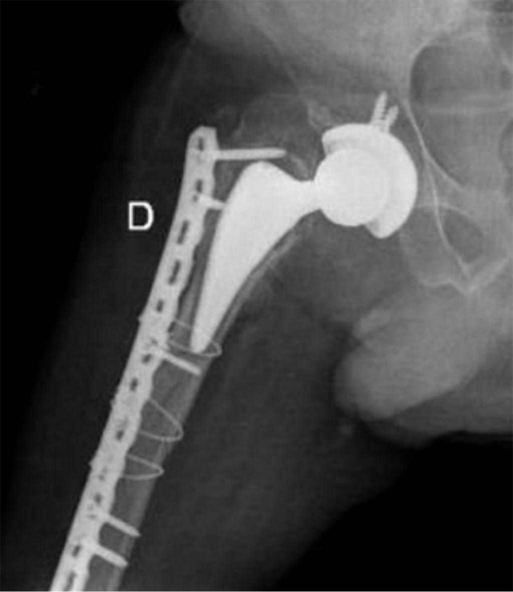 Presentation of case: 46-year-old male PWPS with pain in the right lower extremity after falling from a chair, with a history of right hip arthroplasty six months ago due to a transcervical fracture. Radiographically, a Vancouver C periprosthetic fracture is seen. Open reduction of the fracture is performed and an anatomical cable-type locking compression plate and cerclage cables are placed. An adequate radiographic evolution is observed.