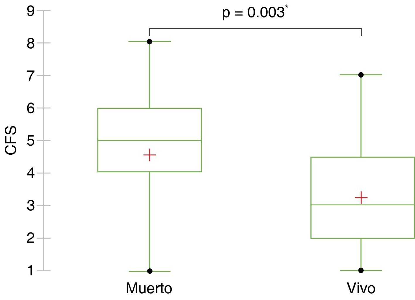 Introduction: frailty prior to admission to critical care units, measured with the clinical frailty scale (CFS), is associated with mortality. Objectives: to determine the association between the CFS score prior to admission to the Intensive Care Unit (ICU) and mortality at hospital discharge in critically ill patients in a private tertiary hospital. Material and methods: an observational, longitudinal, prospective study was conducted. It included all patients admitted to the ICU from March 1 to June 30, 2023. Results: 116 patients with a mean age of 64.2 ± 17.8 years, 45.7% were women. Overall mortality was 18.1%, and it was higher in patients with CFS score ≥ 4 (p = 0.003). The univariate analysis found that the patients who died had as associated factors the SAPS 3 score (p < 0.001), SOFA (p < 0.001), hours of mechanical ventilation (p = 0.004) and CFS score (p = 0.003). In the multivariate analysis, through logistic regression, it was found that the days of hospital stay (p = 0.001), the SOFA score (p < 0.001), the hours of mechanical ventilation (p = 0.015) and the CFS score (p = 0.003) were variables that were independently associated with mortality. Conclusions: CFS is a variable that is independently associated with mortality at hospital discharge and can be used for its convenience to estimate the impact of the condition prior to admission to the ICU on the prognosis of critically ill patients.REFERENCES