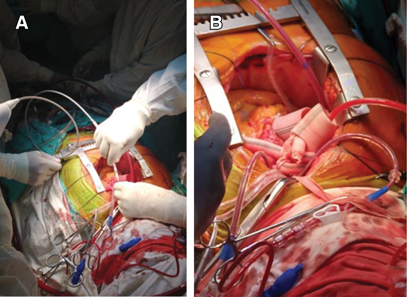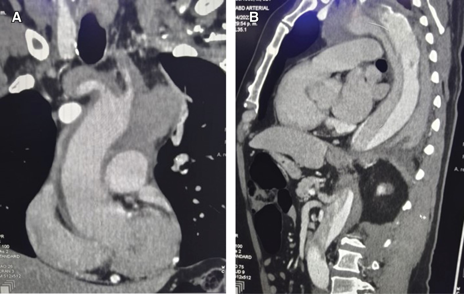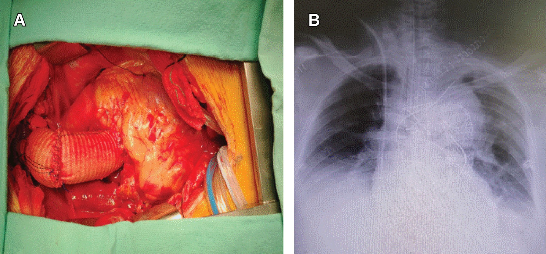 With the previous studies it was decided to undergo surgical treatment. We were provided with a 31 mm × 15 cm GORE® endoprosthesis (Figure 2A), we manually made a 32 mm woven Dacron tube with a 10 mm chimney and another tube of 10 mm for the left carotid and one of 12 mm that will serve for the brachycephalic trunk (Figure 2B). An ultrasound-guided right common femoral puncture was performed and a 6 Fr introducer was placed; a right infraclavicular incision was made, the right subclavian artery was located and vascular control performed and 5/0 purse-string tourniquet, left infraclavicular incision was made and end-to-side anastomosis is performed with a 10 mm woven Dacron tube, median sternotomy was performed and extended with left cervicotomy. Mediastinal structures were dissected, carotid sheath was also dissected, with vascular control of the carotid artery. One vascular shunt was placed, an end-to-side anastomosis performed with a 10 mm woven Dacron. Then, pericardium was incised, the edges marsupialized, a simple purse-string was placed in the right atrium and in the right upper pulmonary vein, and heparin administered, with optimal activated coagulation time, the right subclavian artery was cannulated with a 17 Fr cannula, a trilumen catheter is placed for distal perfusion in the right subclavian artery, the right atrium and right upper pulmonary vein were also cannulated. The body temperature was lowered to reach 18 oC. Then, aortic cross-clamping was performed, aortotomy and direct Custodiol as cardioplegia administered into coronary ostia. Proximal aorta was reinforced with Teflon bands and aortic valve resuspension and anastomosis of a 32 mm woven Dacron tube were performed in ascending aorta. In deep hypothermia, the centrifugal pump was stopped and selective cerebral perfusion was started with a roller pump at 800 ml per minute. Aorta was unclamped and aortic arch resection performed, a hydrophilic guidewire passed through a femoral introducer under vision with true light echocardiography, a GORE-type thoracic endoprosthesis releaser ® was directed 31 mm × 15 cm in the descending aorta, stent was released without complications (Figure 3A). Anastomosis of the endoprosthesis to a 32 mm woven Dacron tube and later to a woven tube of the proximal aorta (supracoronarian) was performed (Figure 3B). The cannula was connected to the arch chimney and the flow is restarted with a centrifugal pump, an end-to-end anastomosis performed from a 10-mm woven tube of the left common carotid to a 10-mm aortic tube. Anastomosis was subsequently performed from the brachycephalic trunk to a woven Dacron tube of 12 mm supra-aortic. Temperature rise began, at optimal temperature extracorporeal circulation is weaned, achieving it on the first attempt, in hemodynamic stability structures are decannulated and anastomosis is performed from 10 mm woven Dacron used as chimney to 10 mm woven Dacron extraanatomical that passes through the left pleura to the left subclavian artery (Figure 4A). Protamine was administered, hemostasis performed and chest draining tubes placed. Chest closure was performed as usual. Surgical procedure concluded without complications. In ICU, a chest X-ray was requested, without observing changes (Figure 4B).