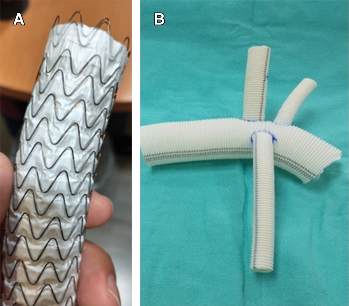 The two commercially available FET prostheses in Europe are E-vita Open Plus™ (Jotec, Hechingen, Alemania) and Thoraflex Hybrid™ (Vascutek Terumo, Renfrewshire, Scotland, Reino Unido). Both devices are available in different sizes and with different delivery systems.