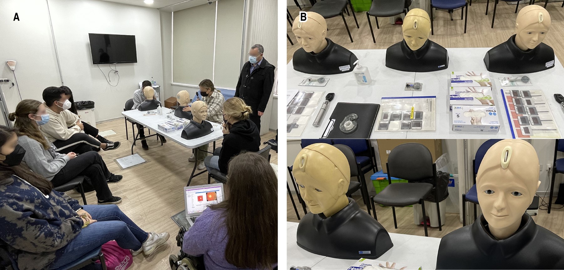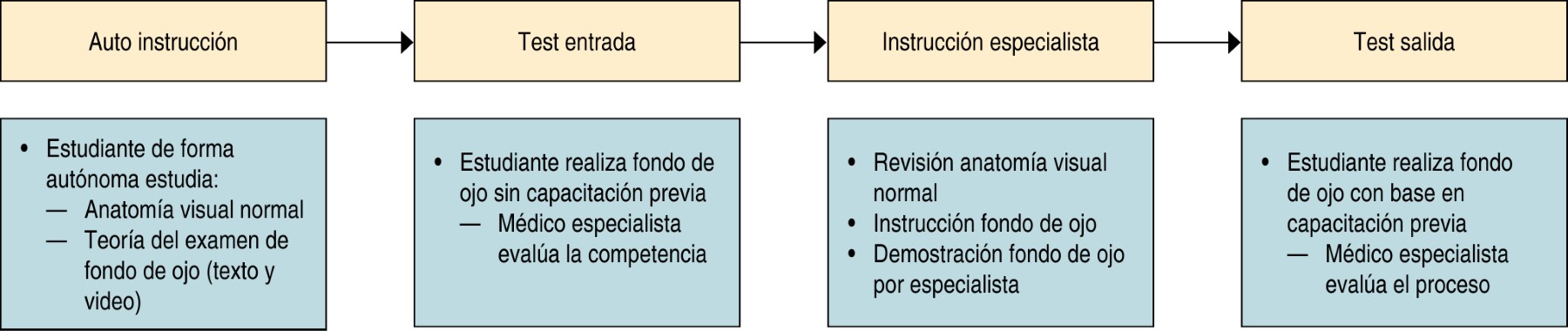 Material and methods: a structured session was conducted in three parts: pre-instruction, specialist instruction, and post-instruction simulation. Students received online learning material before the simulation, where their competency in fundoscopy examination was evaluated using a checklist. Practical and theoretical instruction was provided, including a specialist-guided live demonstration. Subsequently, a second simulation was performed to assess skill acquisition.