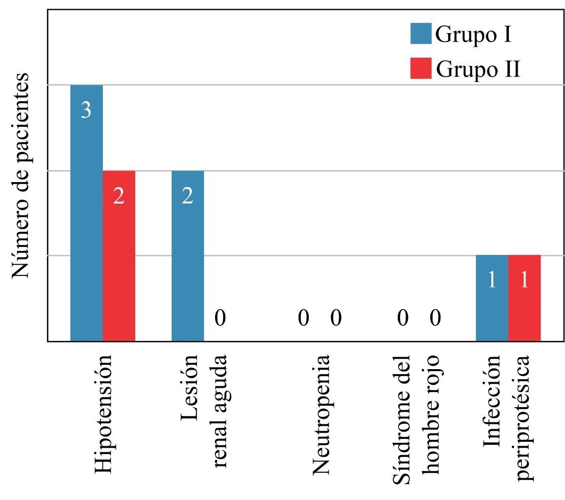 Material and methods: a retrospective review was conducted, including 143 patients at risk of PJI scheduled for TKA who received IO vancomycin along with intravenous (IV) cefazolin, referred to as group I (GI), between May 2021 and December 2022. The occurrence of complications in the first three postoperative months was evaluated. Results were compared with 140 patients without risk factors who received standard IV prophylaxis, designated as group II (GII).
