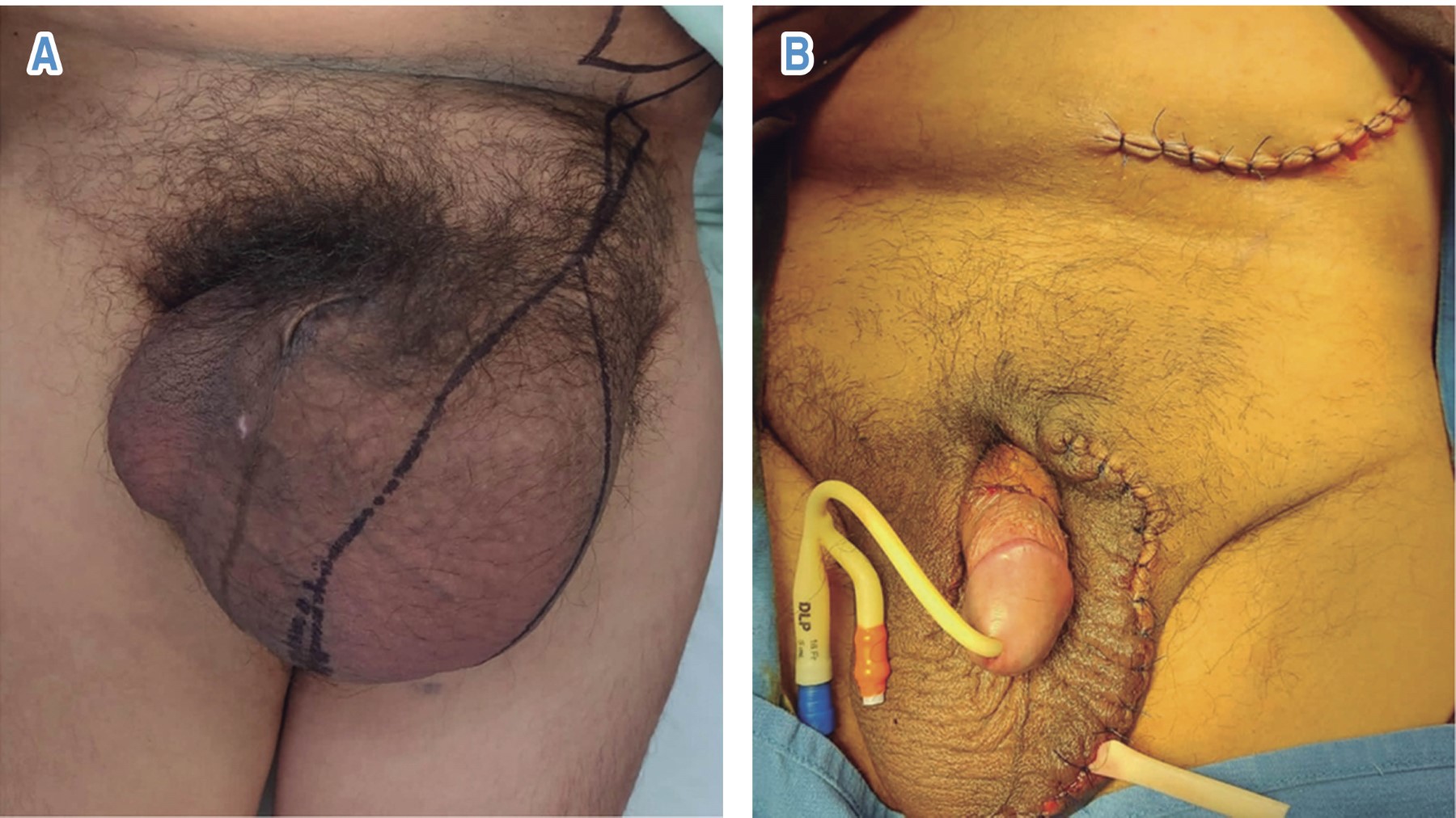 On physical examination, the patient weighed 102 kg, had a height of 1.72 cm, and had a body mass index (BMI) of 35.2 kg/m2. He had a non-reducible, sizeable inguinoscrotal mass that reached the mid-thigh, with peristaltic noises and no translucency. In addition, an occult penis was observed along its entire length, and the presence of dermatitis in the inguinal region and the abdominal-pubic crease (Figure 1A). He was scheduled for inguinal hernia repair, phalloplasty, and scrotoplasty.