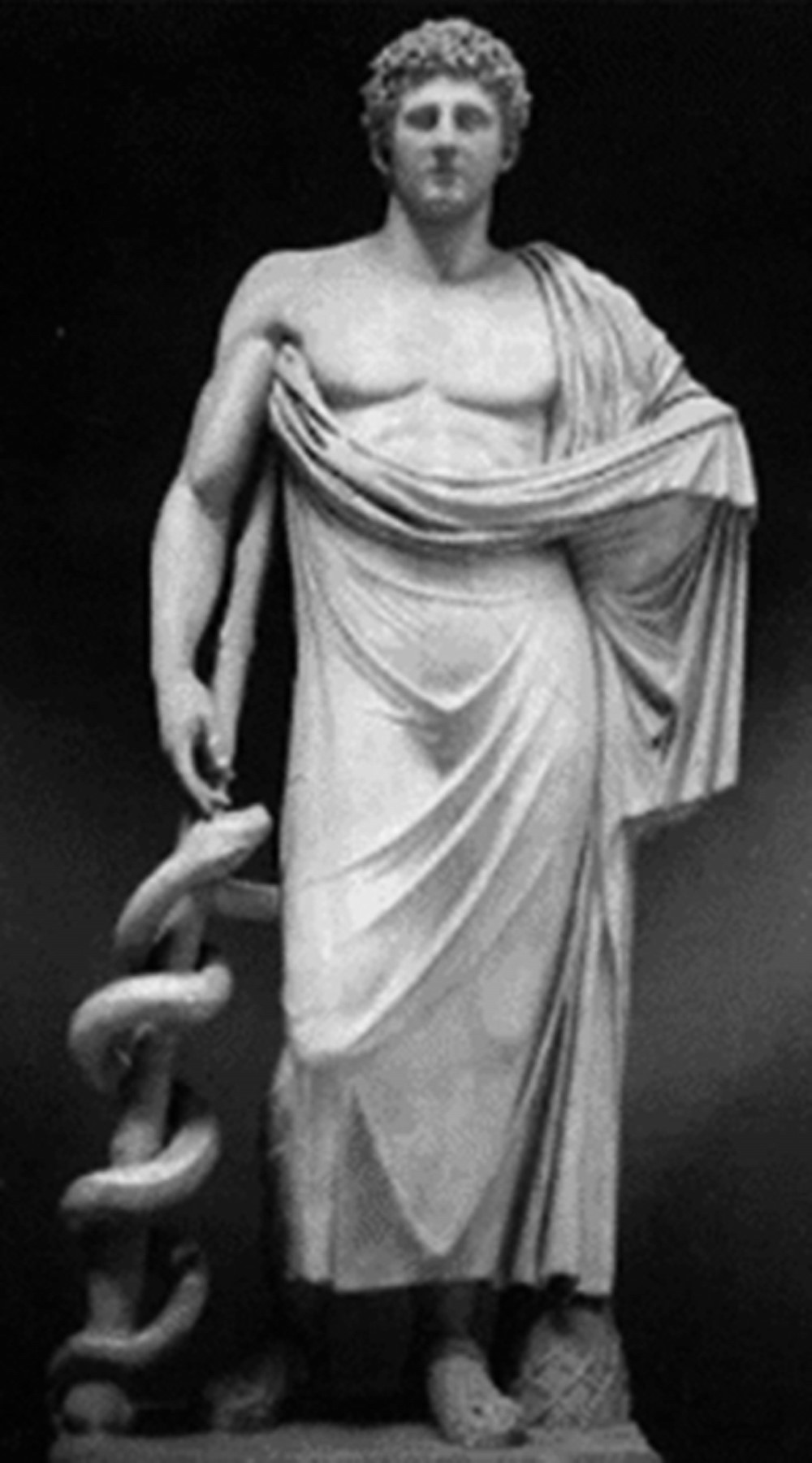 The medical tradition began around the 6th century B.C. in Sidon (40 km north of Tyre), where a temple dedicated to Eshmun, the medical god and equivalent to the Greek Asclepius, was found.7 These studies were carried out by Theodore Makridi Bey (1872-1940), who collected the first elements, probably because he was the son of a Turkish military doctor.8 According to the ancestral culture, Eshmun was a hunter of Berytos (Beirut) who fell in love with the goddess Astarte, but the young man died mutilated; the goddess used the "vital heat", bringing him back to life with attributes of healer and god, which was documented between 754 to 675 B.C.9 In the Phoenician tradition, Eshmún carries a scepter (staff) in her right hand, where a snake is entangled, and a scorpion in her left shoulder (Figure 1). The signs of the serpent and the scorpion (Figure 2) are beneficent as they signify the renewal, the other the healing medicine, and both health, fertility, and fecundity. These symbols passed from the Phoenicians to the Greeks and Romans about a century later, when the Phoenicians traveled the Mediterranean and brought their culture to Greece and Rome. Today, the symbols are used in medical schools and medical practice, with the oldest written reference dating back at least 3,300 years.