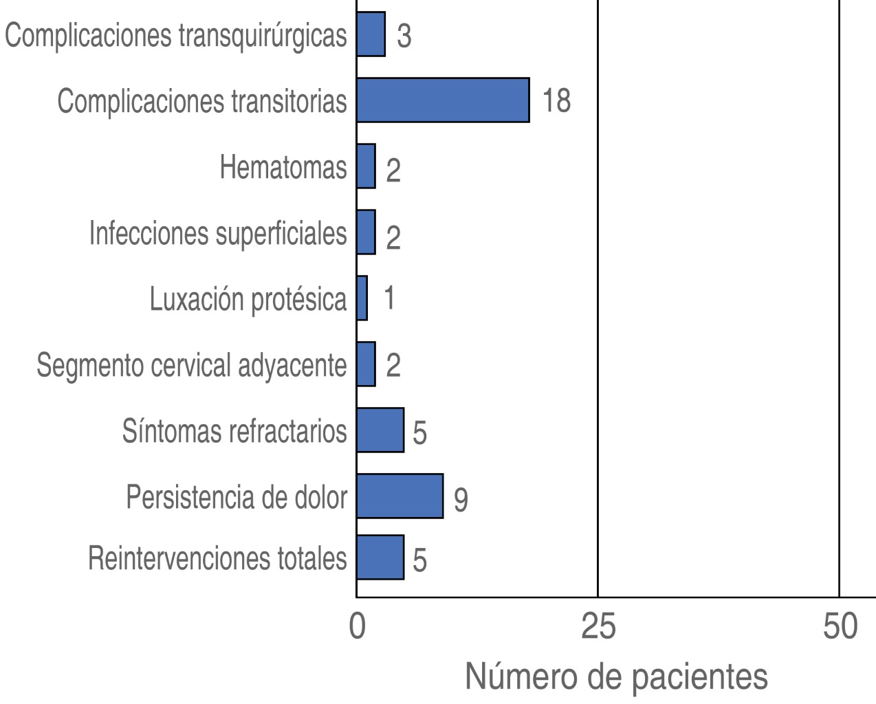 Results: an affected age range was found from 33 to 74 years, with the majority being women affected in the C5-C6 cervical segment and the most applied intervention was hybrid arthroplasty, a post-surgical and symptom improvement of 95%, with immediate mobilization of patients, an average hospital stay of three days, a low range of adverse effects and a low rate of complications comparable to the global literature, with a satisfactory integration into daily living and physical activities in 94%, with development of adjacent segment disease in two patients and only one of them requiring surgical reintervention.