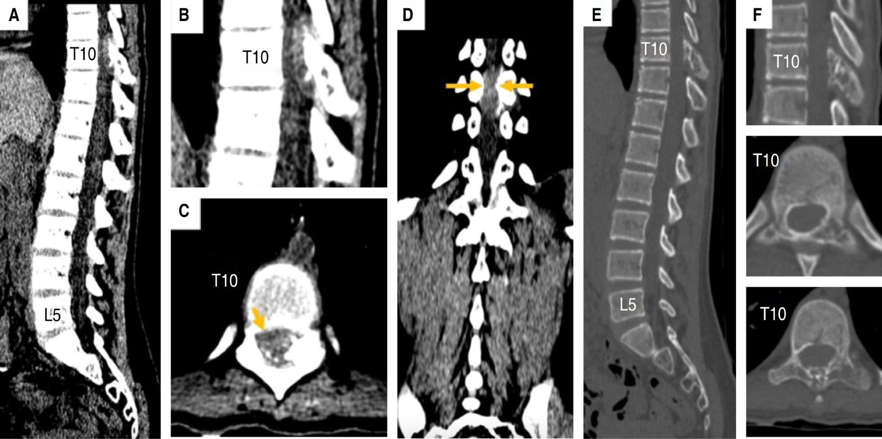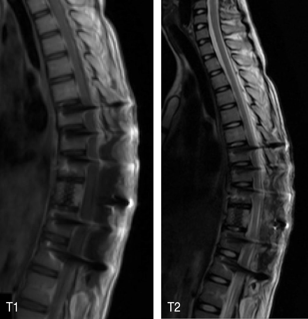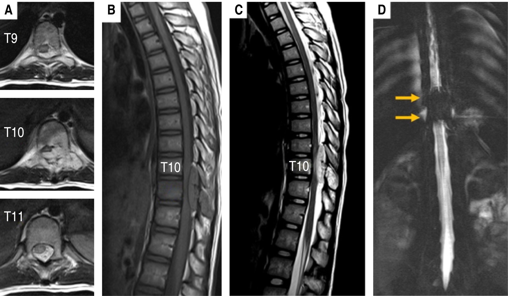 Introduction: mesenchymal chondrosarcoma (MSC) is a rare and aggressive subtype that represents only between 1 to 10% of primary chondrosarcomas, the majority of these tumors are believed to originate in the bone, 50% of reported cases have a extraosseous origin, including the brain and meninges. It is extremely rare to find MCS as a primary lesion of the bony elements of the spine; the thoracic vertebrae are most often affected. Histologically, it is believed to derive from cartilage-forming primitive mesenchymal tissue and is characterized by the presence of solid, highly cellular areas composed of round or slightly fusiform primitive mesenchymal cells with foci of cartilaginous differentiation. Spinal MCS can present with a wide variety of symptoms, including sensorimotor deficits, back pain, and radiculopathy. MRI is the preferred imaging modality for intraspinal tumors, but there is no pathognomonic description for MCS. The common differential diagnosis of intraspinal and extramedullary spinal masses with variable enhancement on magnetic resonance imaging (MRI) includes meningioma, nerve sheath tumor, and myxopapillary ependymoma, but MCS should also be considered. Radical surgery with complete tumor removal is considered the best therapy option for intraspinal MCS, obtaining wide surgical margins to achieve local eradication. Local radiotherapy and postoperative systemic chemotherapy can reduce local recurrence rates, and may reduce the risk of metastasis. The course of MCS can be prolonged, with a tendency toward late local recurrence and metastasis.