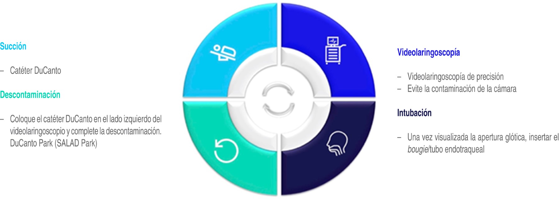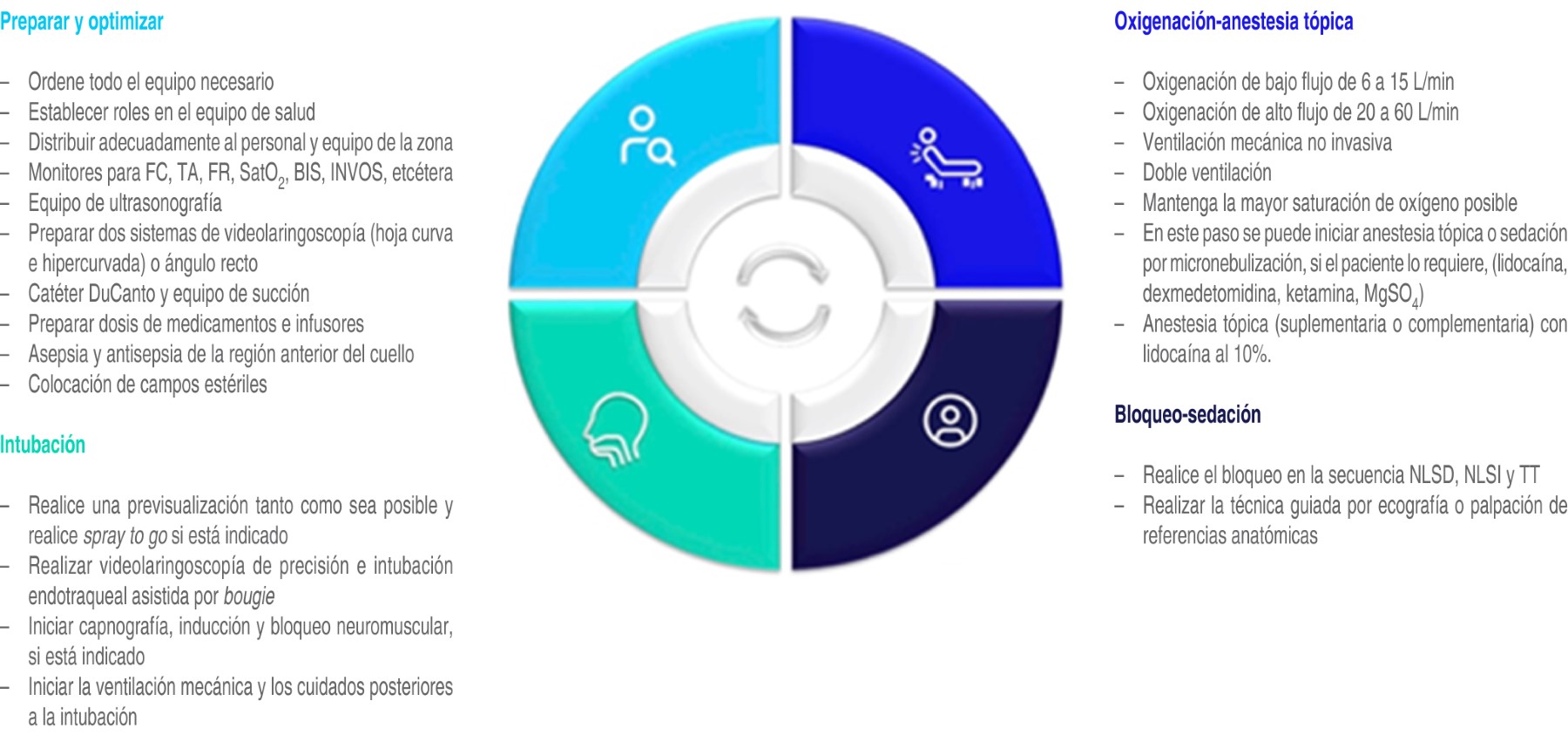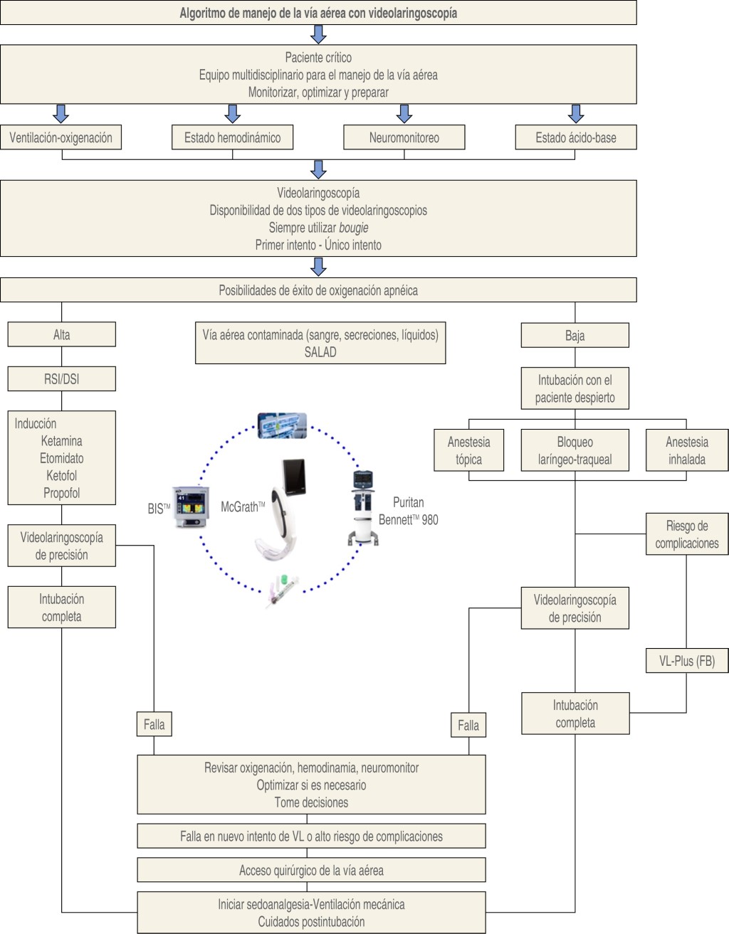 Airway management is a critical intervention, being a challenge in complicated patients and scenarios. The development of video laryngoscopes and their great advance in availability and acceptance have redefined intubation strategies, guaranteeing effectiveness, safety and speed. The need to have an airway management algorithm under videolaryngoscopy that meets the current parameters of guaranteeing patient safety, always avoiding complications in the peri-intubation period, should be ideal in all critical areas (anesthesiology, critical medicine, emergency medicine). Taking into account the characteristics of critical or severe patients, it is necessary to have guidelines or action plans that allow the adoption of these devices as a management standard without losing sight of a multidisciplinary care approach in airway management. An easy-to-remember and apply algorithm optimized for video laryngoscopes is presented, based on four critical pillars: oxygenation-ventilation, hemodynamic status, acid base and neuromonitoring and with the recommendation of guaranteeing a single intubation attempt always assisted by a bougie during videolaryngoscopy.