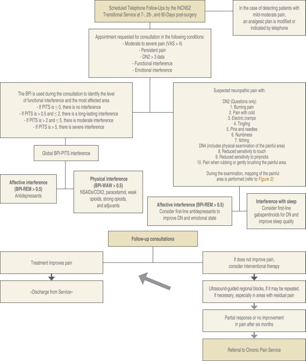 In the preliminary results of this research project, we identified that specific symptoms detected with the DN2, such as cold pain, tingling, pins and needles sensation, electric shock, and numbness, are significantly associated with functional interference. These findings highlight the importance of a comprehensive and early evaluation of postoperative pain, particularly neuropathic pain, which requires a specific approach to mitigate its functional interference and improve long-term quality of life during patient recovery. Throughout this research project and establishing acute and transitional pain pain services at INCMNSZ, we have concluded that rigorous follow-up from the immediate postoperative period, including telephone contact with patients at seven days, 28 days, and three months, along with early analgesic interventions, offers clear advantages. Utilizing the BPI to assess functional interference, the DN4, and the possibility of consultations for physical examination and the establishment of early treatment proves to be superior compared to unrecognized chronic postoperative pain, which can significantly compromise patients' long-term quality of life. We have observed that early treatment can have a preventive effect.