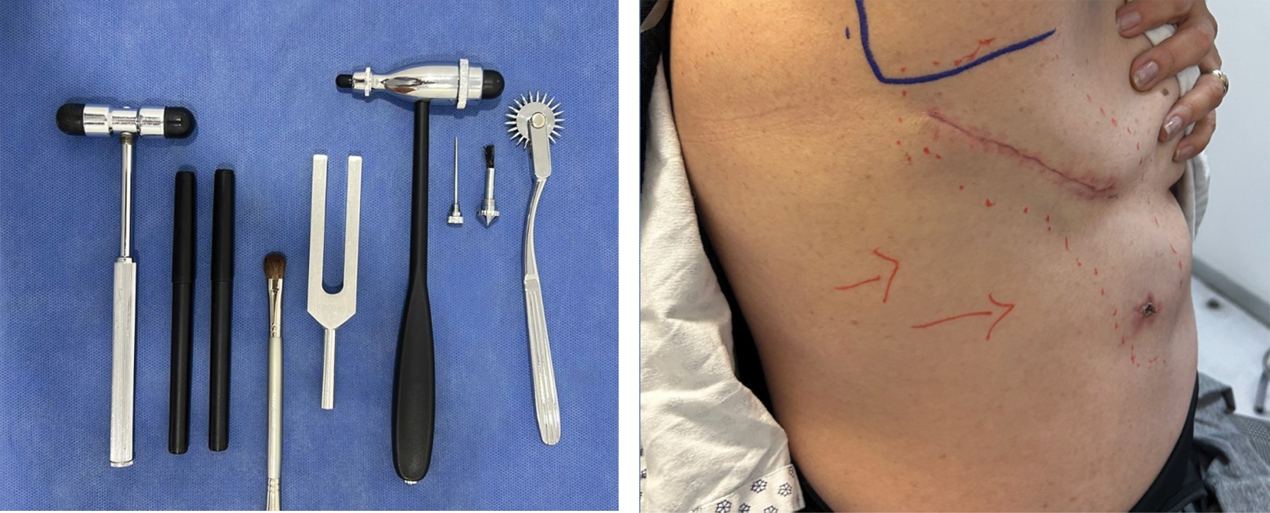 It is crucial to pay detailed attention to the somatosensory system, evaluating responses to touch, pain, cold, and heat to identify areas of mechanical and/or thermal hypoesthesia, hyperalgesia, or allodynia. The clinical evaluation can be conducted at each consultation using simple instruments such as cotton swabs, reflex hammers, Wartenberg wheels, tuning forks, Weber compasses, needle esthesiometers, and von Frey filaments, among others. During the physical examination, mapping the painful area with a dotted line represents allodynia or hyperalgesia, while a solid line represents areas of hypoesthesia (Figure 2). Repeating mapping areas with sensory alterations during follow-up consultations can reveal somatosensory changes. However, these are not always directly related to the intensity and severity of neuropathic pain. It is advisable to map these areas on schematic diagrams of the patient's anterior and posterior body to compare possible responses to neuromodulator treatment at each consultation.