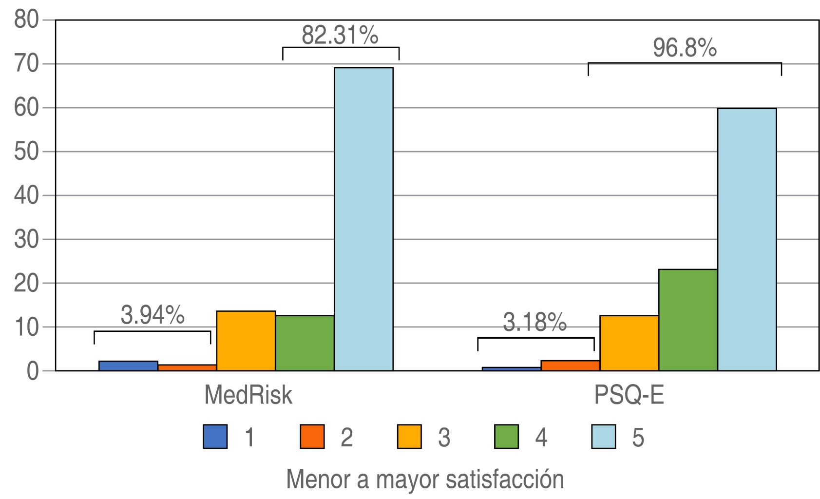 Results: we analyzed 323 user surveys. The mean satisfaction was 4.4 (0.6) with PSQ-E and 4.6 (0.5) for MedRisk. We detected 125 responses classified into three different areas of opportunity by the PSQ-E. The determinants associated with less satisfaction were basic schooling, users with paid activity, diagnosis > 1 year and group sessions.