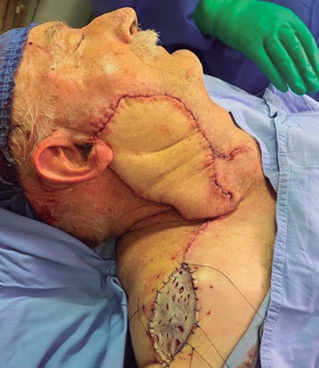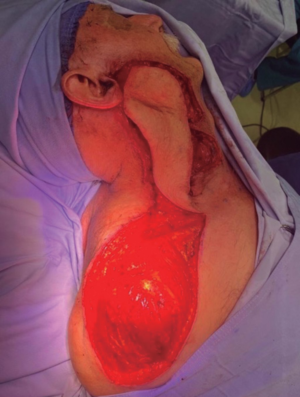 The supraclavicular flap has been used since 1970 for reconstructing defects of the face and neck. It is considered a cornerstone owing to certain aesthetic characteristics that match those of the face and neck skin, its practicality and effectiveness. Besides this, it does not need infrastructure or expertise in microsurgery to be able to carry it out. It has a very low morbidity since muscle is not required for this technique. This paper presents the case of an elderly patient who underwent the resection of a large face and neck tumor and reconstruction afterwards with the supraclavicular flap, restoring the skin cover of a large area in the face and neck with the best option with excellent results in terms of aesthetic and function, which is why this technique is described hereafter and some aspects to carry out the procedure are described, highlighting its advantages and advice in order to obtain the best results and to avoid complications.