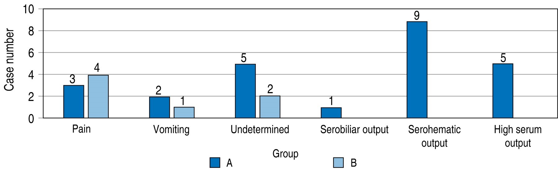 Serobiliary, serohematic, and high serous output only appear as causes of prolonged stay in group A since, in the absence of drainage in group B, eventual hematic or biliary leaks were not noticed.
