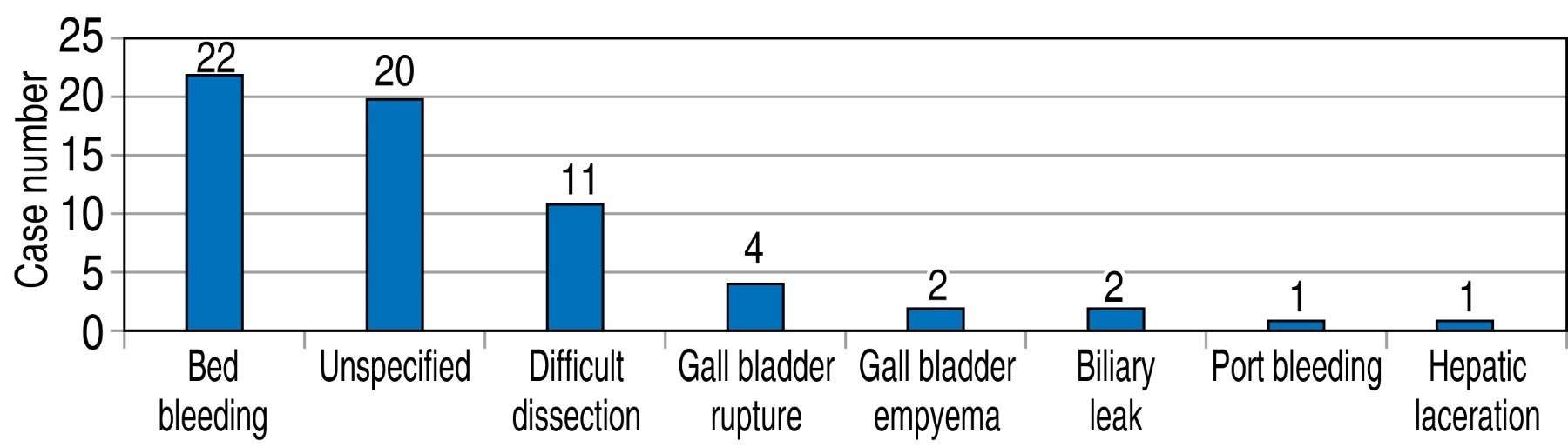 Group C consisted of 63 patients. When the causes for the placement of drains at convenience were analyzed, only two cases (3.2%) did the decision adhere to the elimination criteria established during the planning phase (biliary leak), and in 41 cases (65%) the reasons were different from those pre-established. In 20 (31.8%), the surgeon did not specify the causes. The results are shown in Figure 2.