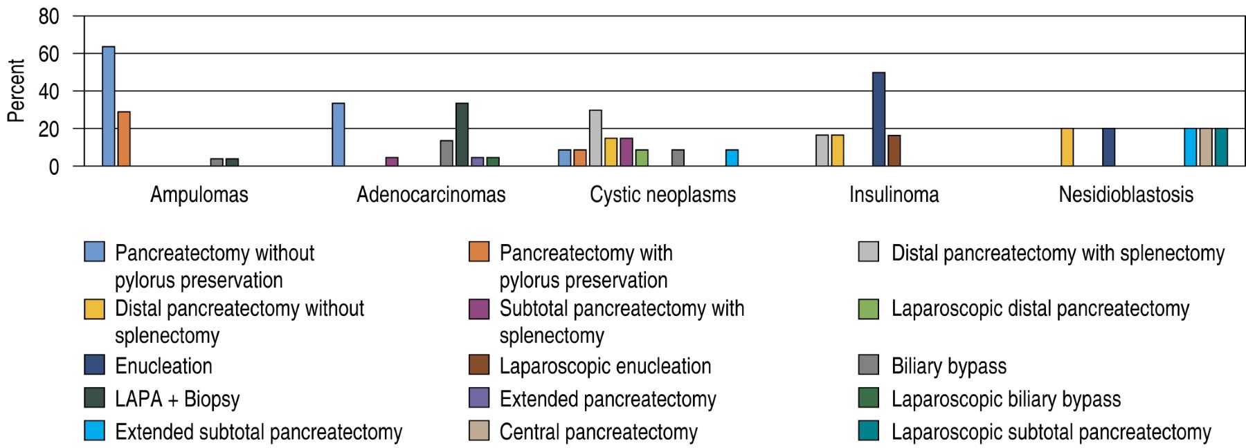 The surgical techniques used for the resection of pancreatic tumors are twofold: one consisting of tumor enucleation indicated only for small benign pancreatic tumors that do not affect any adjacent structure or the pancreatic duct, and the other in which extensive pancreatic resections such as cephalic, total, or distal duodenopancreatectomy are performed.