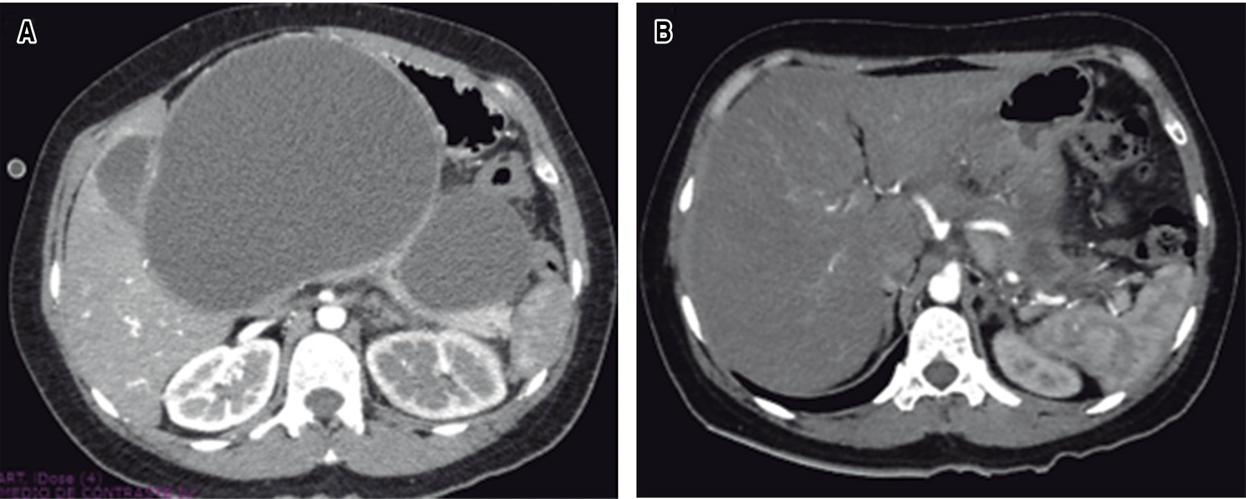 An abdominal CT scan with intravenous contrast was performed with a report of an enlarged pancreas with ovoid lesions on the head and body, measuring 229 × 137 × 182 mm with an approximate volume of 2,899 cm3 and a second lesion measuring 100 × 57 × 82 mm with an approximate volume of 238 cm3, with homogeneous density, thin walls, compatible with cystic lesions. The gallbladder measured 80 × 43 × 35 mm and had a thin wall with heterogeneous content due to a liquid-liquid level of biliary sediment (Figure 2).