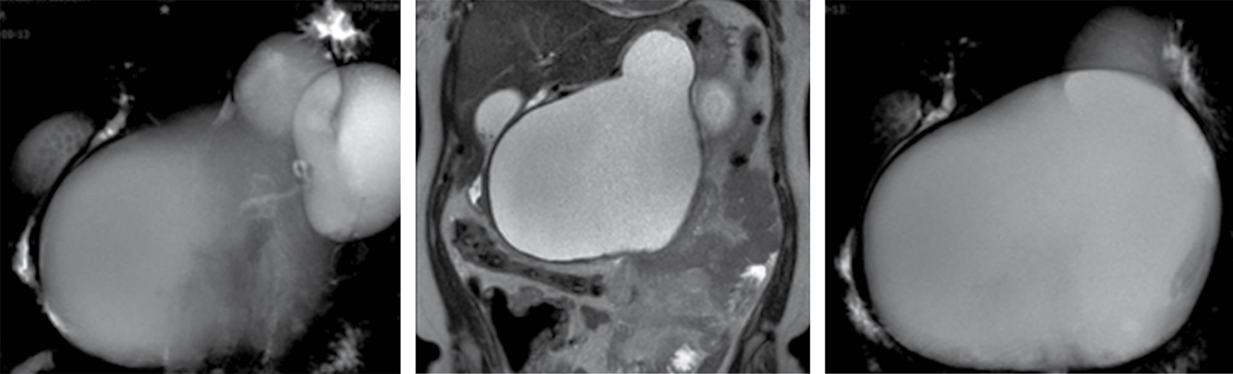 A magnetic resonance cholangiography was performed during her hospitalization. As a preoperative diagnostic approach, the following was found: a non-dilated intrahepatic biliary tract, a choledochal duct measuring 5.9 mm, a gallbladder of usual size with heterogeneous content due to the presence of multiple polyhedral images concerning biliary stones, and an extrahepatic tract displaced laterally by a lesion compatible with pancreatic pseudocysts. The pancreas had an altered morphology at the expense of two ovoid lesions, with well-defined lobulated borders, homogeneous hyperintense content in the T2 sequence, and a volume effect conditioning the opening of the duodenal arcade with lateral displacement of the stomach, limiting gastric distension. The largest lesion measured 178 × 179 × 155 mm with an approximate volume of 2,089 cm3, and the smallest lesion measured 56 × 76 × 95 mm in its principal axes with an approximate volume of 213 cm3. Before the surgical procedure, serum tumor markers showed an alpha-fetoprotein (AFP) 0.79 ng/mL, CEA 1.16 ng/mL, human chorionic gonadotropin (HCG) < 0.10 mIU/ml, CA-125 17.37 U/ml, CA15-3 16.2 U/ml and CA19-9 8.25 U/ml (Figure 3).