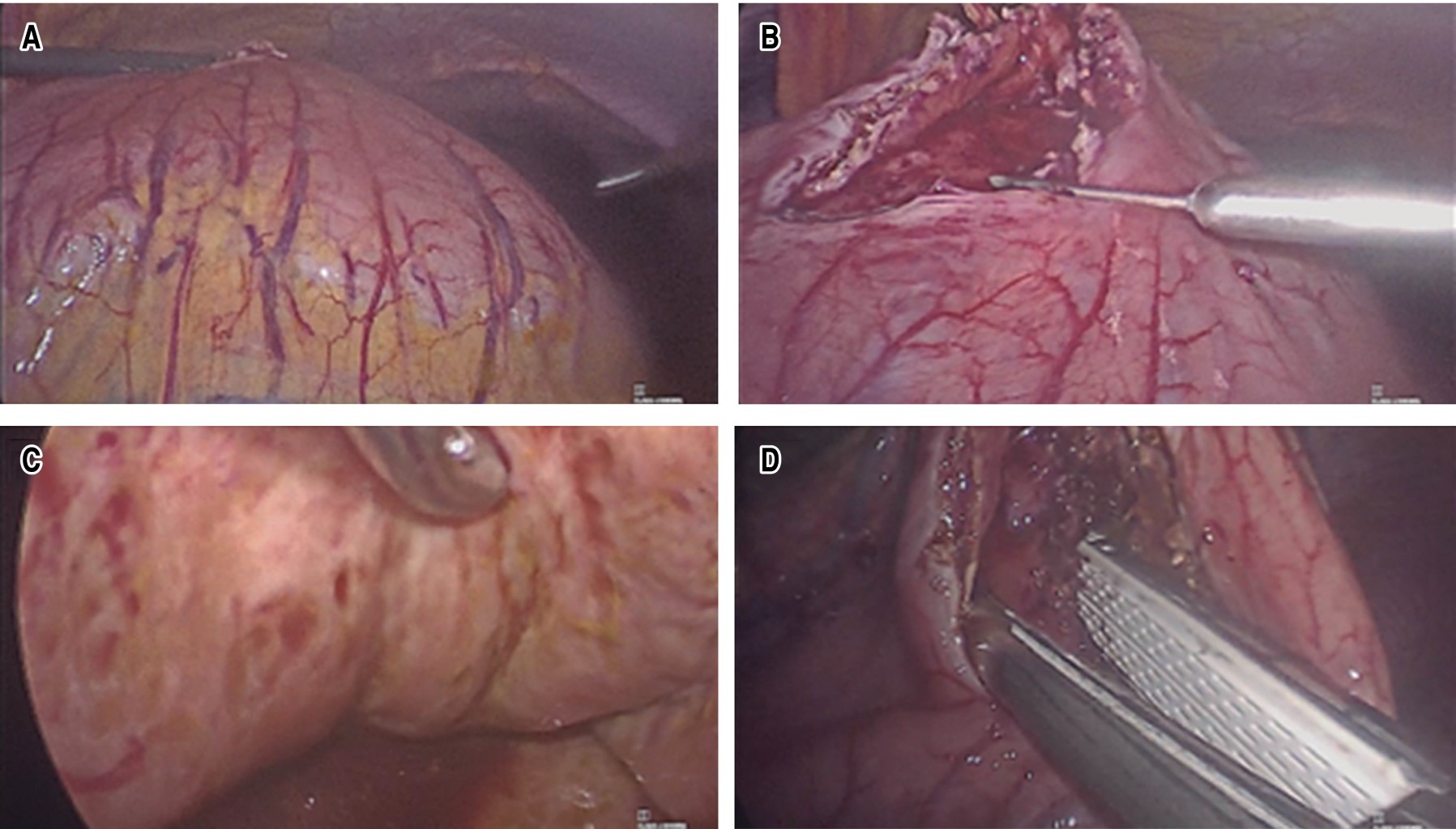 After informed consent, a laparoscopy was performed. The stomach was bulging and displaced by a retro gastric tumor (pseudocyst) of approximately 200 × 180 × 170 mm and a Parkland 2 gallbladder; macroscopically, the liver was normal, and the rest showed no alterations. We proceeded to perform cystogastroanastomosis with an endo GIA stapler, obtaining abundant liquid with a rusty appearance. The aspirated liquid from the pancreatic pseudocyst was approximately 2,000 cm3. The pseudocyst cavity was checked, and scarce necrotic tissue was found; blunt debridement of necrotic tissue was performed with gauze, the liquid was drained from the small pseudocyst, and approximately 200 cm3 of liquid was obtained. An anterior gastrostomy was closed in two planes, and leaks were verified. Subsequently, laparoscopic cholecystectomy was performed conventionally; Penrose-type drains were placed towards the vesicular bed and proximal to the gastrostomy (Figure 4).