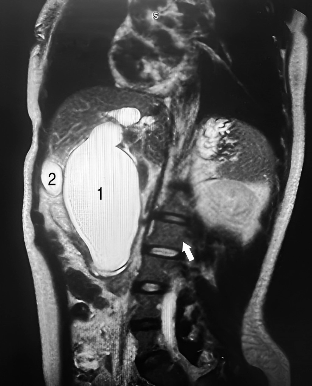 Findings: an atrophic gallbladder without the presence of gallstones, a 7.6 mm cyst in the cystic duct, saccular dilatation of the intrahepatic and extrahepatic bile duct with a diameter of 18 mm in the right hepatic, 15 mm in the left hepatic duct and a confluence zone of 33 mm (carina) was seen. A maximum dilatation of the common bile duct of 70 mm, distal common bile duct of 23 mm, and the duct of Wirsung with normal dimensions were observed.