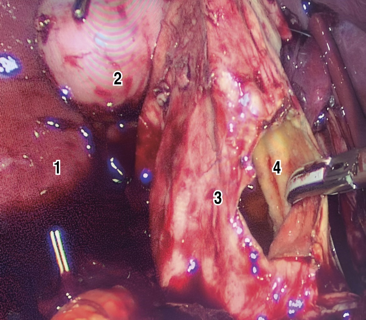 Elective resection was scheduled laparoscopically (Figure 5) after completing a thorough preoperative protocol. Intraoperative findings evidenced a QC-IVA-Todani-modified, with an atrophic gallbladder. Dissection of the cyst capsule was initiated by attempting to separate it from the vascular structures (portal vein and hepatic artery). It was decided to open the cyst to facilitate its dissection. However, due to its strong adhesion and vascularization, with scarce but continuous bleeding, it was converted to open surgery through a Kocher-type incision.