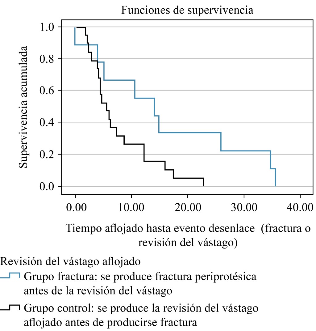 Results: pain intensity (VAS) was the most important aspect (p = 0.01), predominating in the controls. The simple radiological parameters did not show statistically significant findings predictive of peri-prosthetic fracture (number of Gruen zones, sum of them in mm, stress shielding, pedestal, polyethylene wear, stem subsidence). The role of complementary tests (CT and scintigraphy) for the definitive diagnosis of loosening was relevant, but not significant. The type of implant showed no differences. Overall implant survival was higher in cases than in controls (p = 0.016). This difference continues when comparing each loosened stem until fracture or replacement (p = 0.024).
