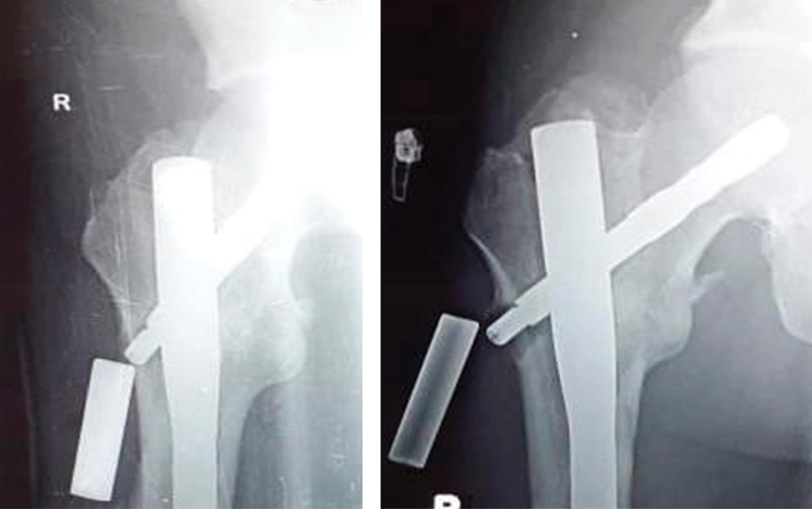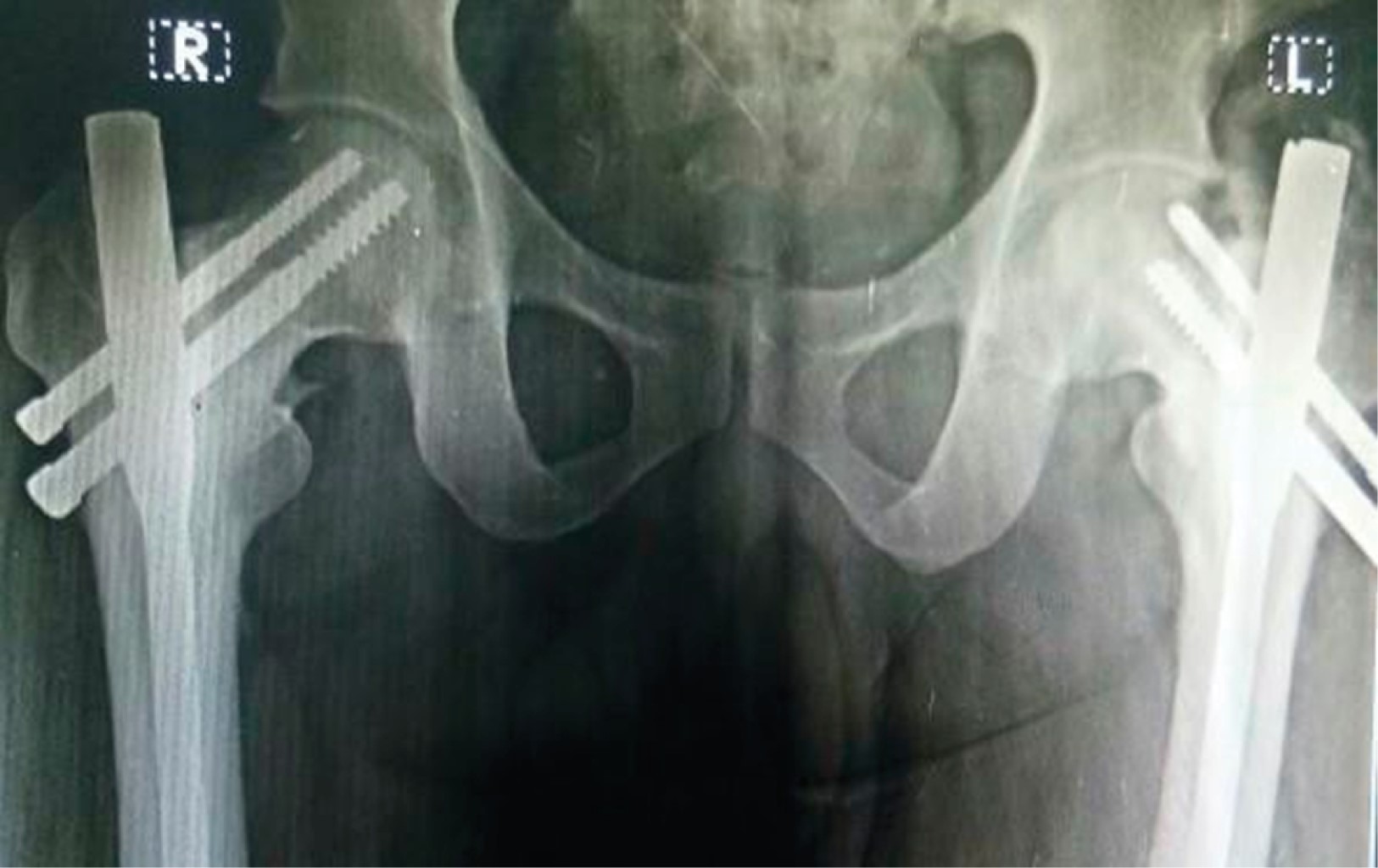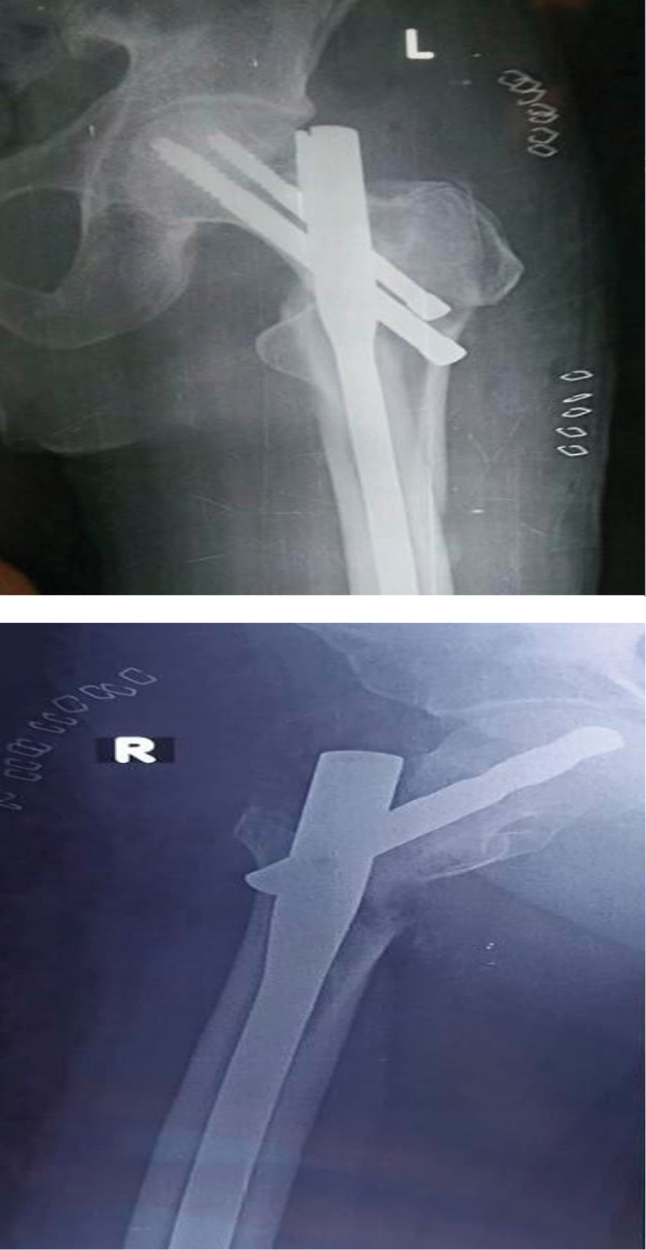 Clinical and radiological assessments of fracture union/complications for all patients were done pre- operatively and post-operatively at six weeks, three months, six months, and one year. Functional evaluation was conducted at 1-year post-op using the Harris Hip Score.