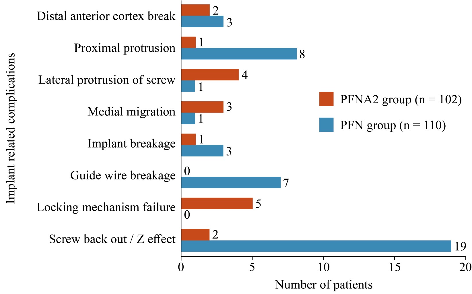 We observed nearly double the number of complications in the PFN group compared to the PFNA2 group, with implant-related complications constituting a significant portion, reinforcing findings from previous studies.20,21,22,23 Gardenbroek et al. found that the risk of secondary late complications and reoperation is much higher with PFN than with the helical blade device.20 Overall, implant-related complications were 34% in the PFN group.7,20,21,22,23