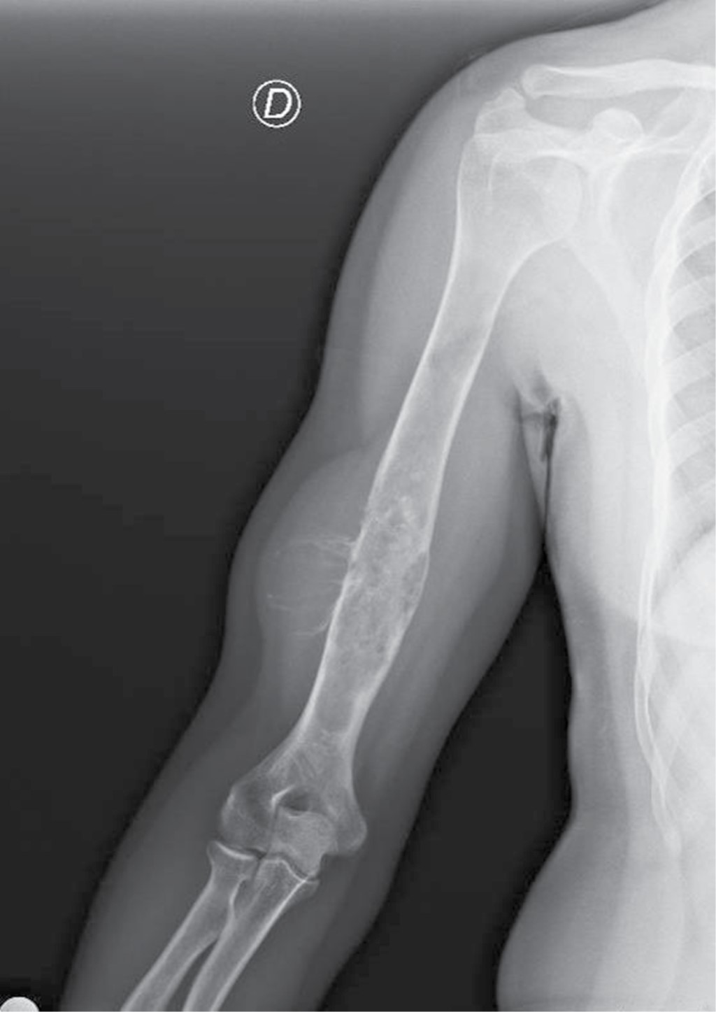 During outpatient follow-up, extended studies were performed for staging; the chest and abdomen were normal on computed tomography (CT), and a bone scan showed uptake solely at the level of the humeral mass.