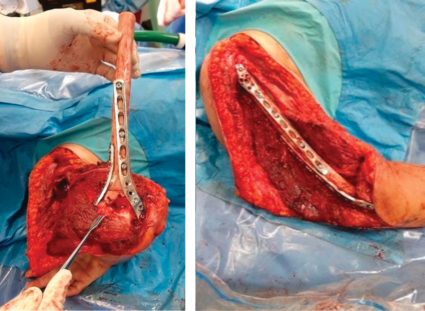 According to the surgical plan, the procedure was performed as follows. First, an expanded deltopectoral approach was performed, including the previous biopsy within the tumor lesion, curving toward the side and in the posterior and longitudinal directions over the olecranon. Subsequently, the tumoral lesion was dissected with wide lateral, middle and distal margins; at this level, the margin was close to the radial nerve, which was controlled along its entirety with neurolysis. Then, the deltoid muscle was dissected, exposing the axillary nerve, followed by tenotomy at the insertion points of the latissimus dorsi and pectoral muscles with complete dissection of the humerus, preserving the biopsy scar as part of the surgical specimen. Finally, osteotomy of the proximal humerus was performed at the level of the lower edge of the subscapularis muscle, and osteotomy of the distal supracondylar humerus was performed at the level of the olecranon fossa (Figure 4). Based on the MR images, adequate margins were obtained; then, frozen samples from the proximal and distal ends were examined and found to be negative. The defect was reconstructed with a massive allograft of the proximal humerus from the bone bank and proximal and distal fixation with plates and screws for osteosynthesis under adequate fluoroscopic control (Figure 5). Soft tissue reconstruction was performed by flap rotation and hemostasis followed by layered wound closure and skin stapling.