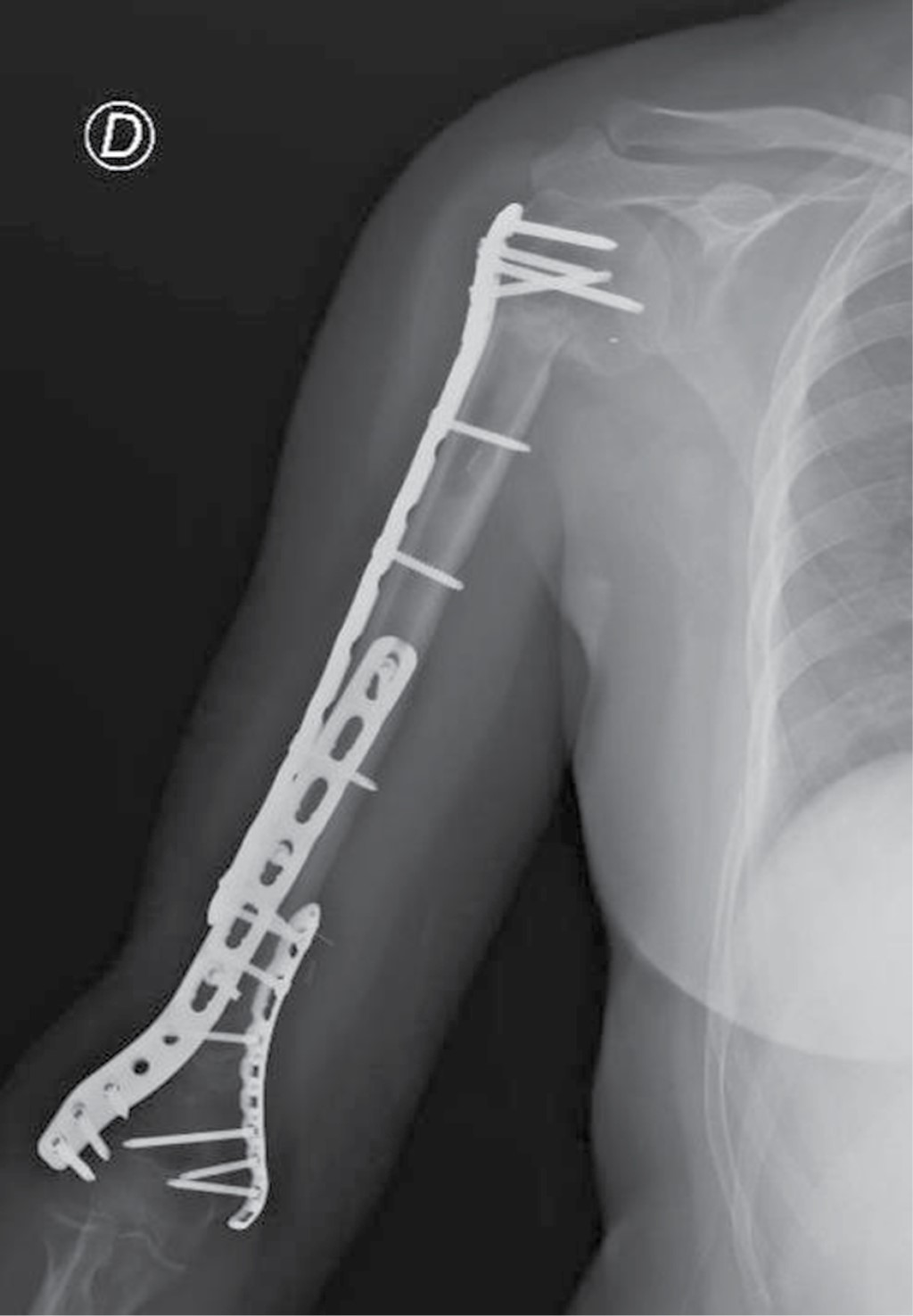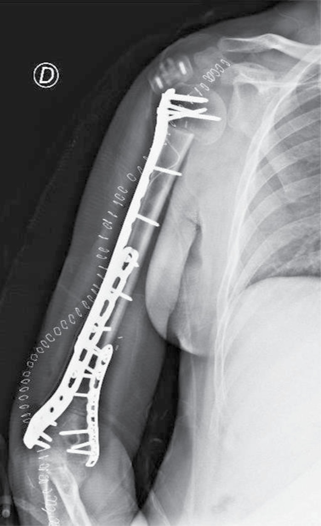 A control radiographic image was taken in the immediate postoperative period showing adequate congruence of the allograft with the host bones and fixation with the osteosynthesis material in the right humerus (Figure 6).