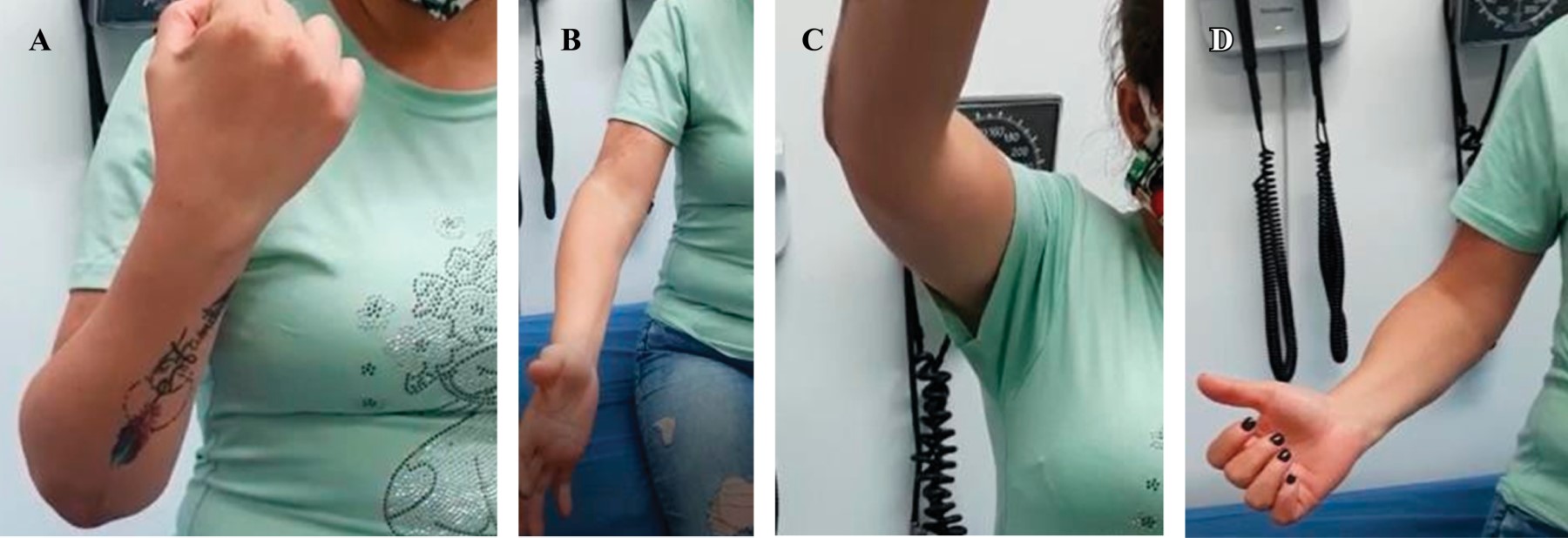 Clinical follow-up continued, with acceptable postsurgical evolution, including allograft consolidation at three months (Figure 7). Physical examination of the upper right limb showed hypoesthesia and an interosseus motor deficit in the 5th finger, which progressed to complete improvement. The range of motion of the shoulder reached 150 degrees of flexion, 90 degrees of abduction, and 45 degrees during external rotation and adduction, while that of the elbow reached 10 to 110 degrees of flexion-extension with complete pronosupination (Figure 8).