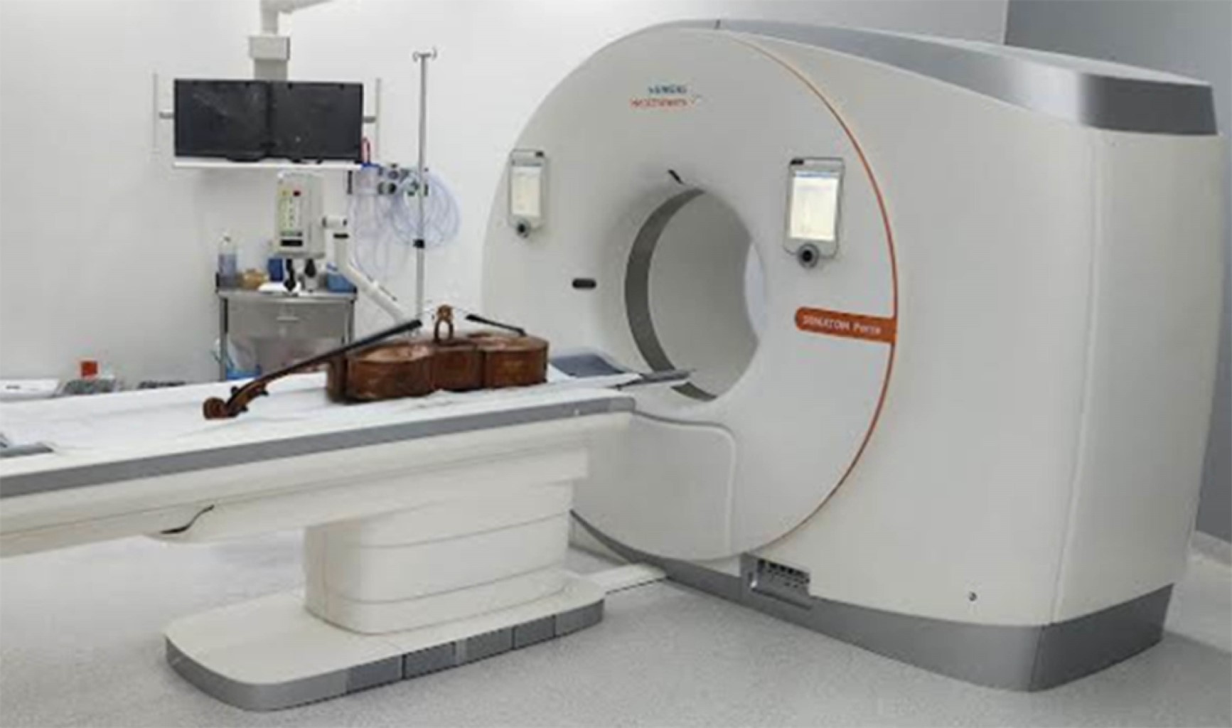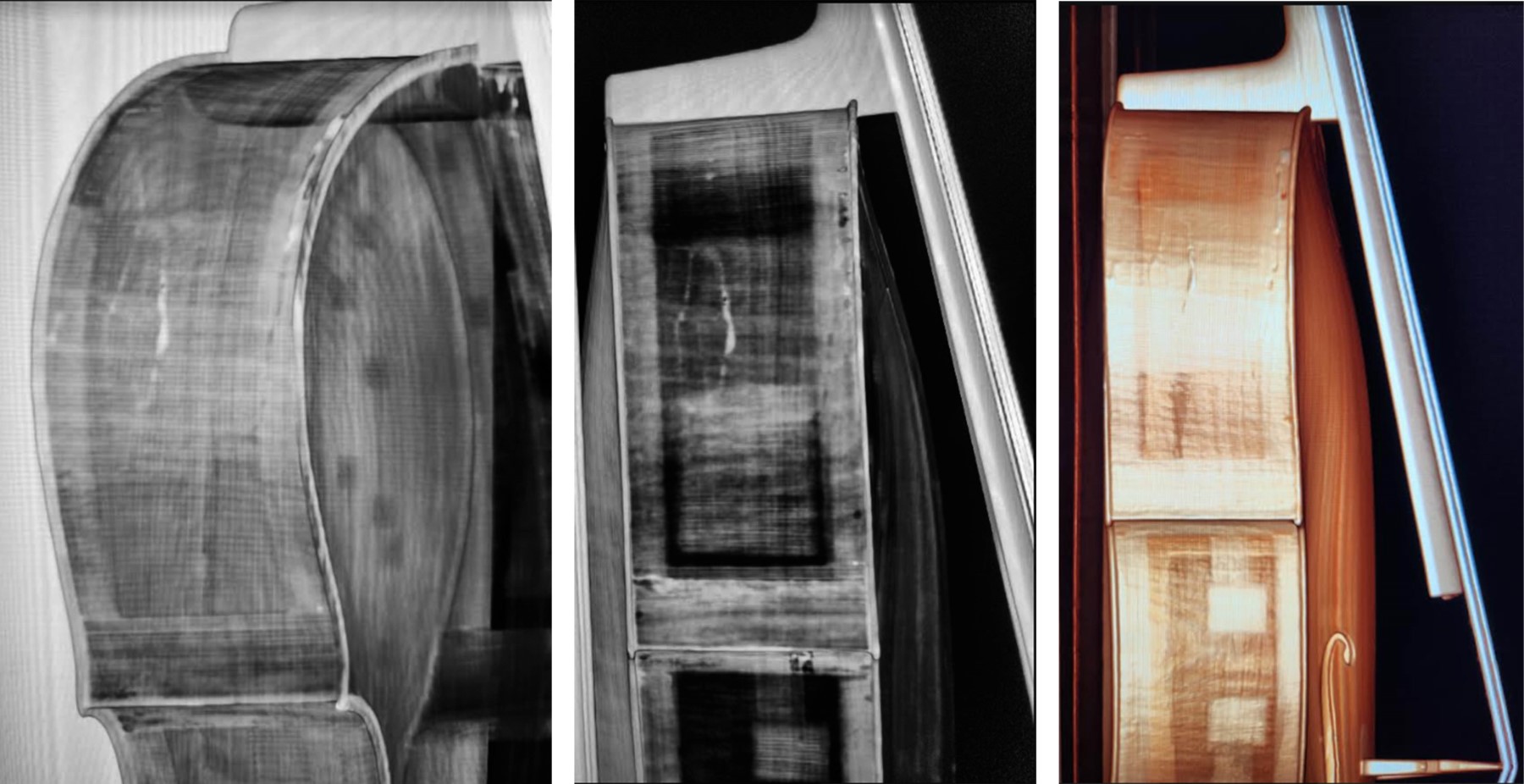 For many years, radiological studies have been used particularly for the evaluation of paintings on old canvases, with the aim of knowing the presence of other paintings (finished or unfinished), and especially in cases of possible forgeries.The hollow structure of a good number of musical instruments, especially stringed ones, as they are made of wood, make them ideal for study using sectional imaging tools, such as computed tomography. The relatively low number of metallic elements (which cause electronic devices, such as hard beaming) does not generate image degradation, allowing the wall thickness to be accurately obtained, as well as possible cracks or fracture areas that have not involved the visible face of the instrument. The current possibilities for obtaining three-dimensional volumetric images, as well as the assignment of color maps based on density and the possibility of virtual navigation, without the slightest doubt that they can be of great help for the comprehensive assessment of said musical instruments. It is relevant to mention that, in both Germany and Austria, since 1988 there has been a project for the study of ancient instruments, through CT. It turned out to be a unique, fascinating and very enriching experience, where medical science with high technology meets art and history.