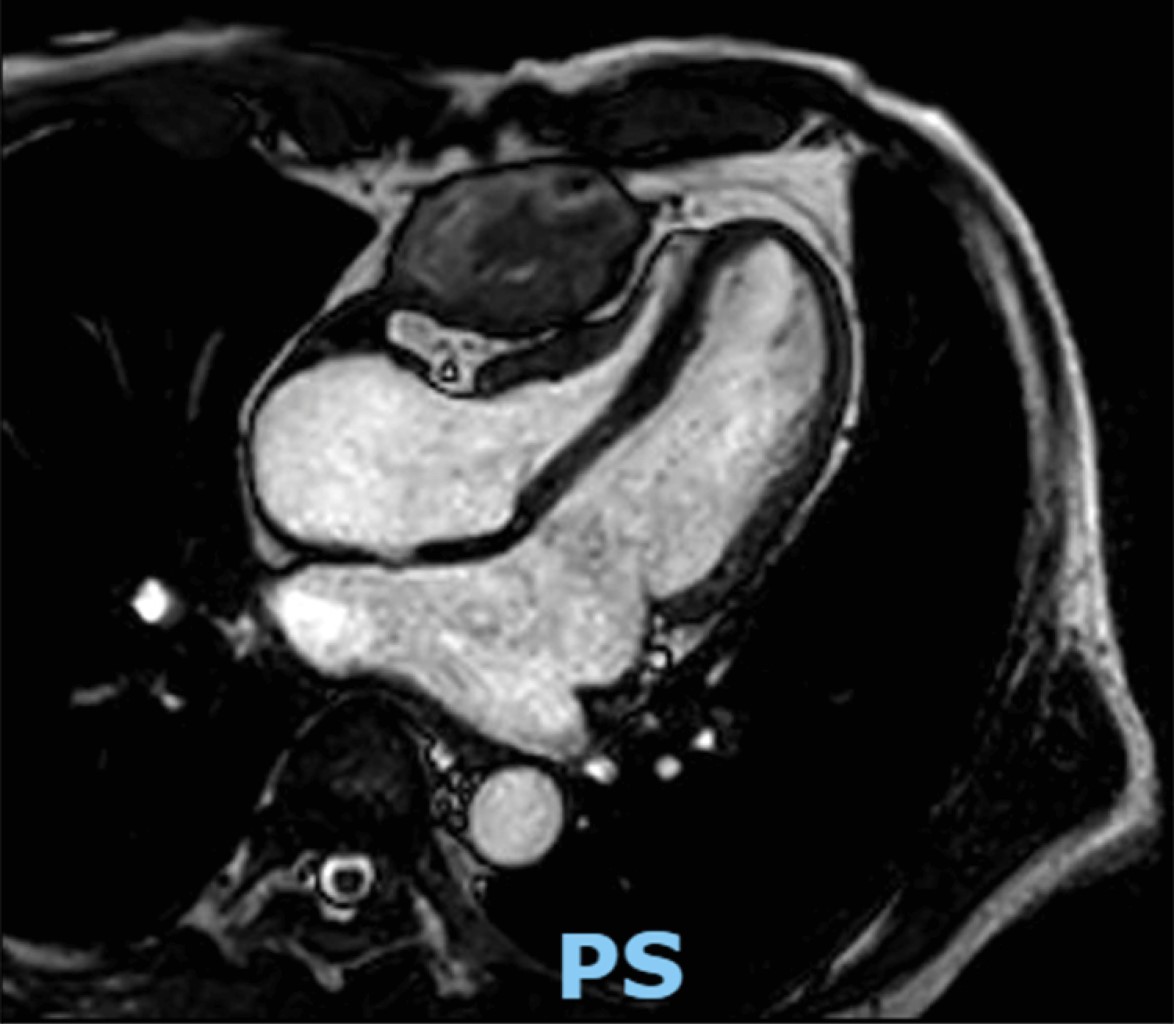The MRI showed an intrapericardial lesion measuring 58.1 by 6.7 mm with irregular margins, heterogeneous in all sequences, predominantly hypointense. There was no contrast enhancement observed, and it showed compression of the right ventricle, restricting diastolic filling and limiting contractility (Figure 1).