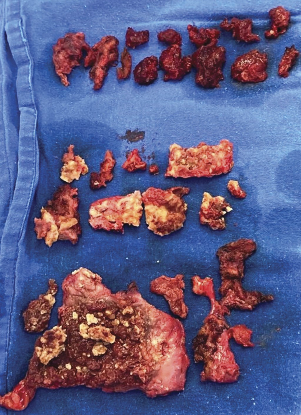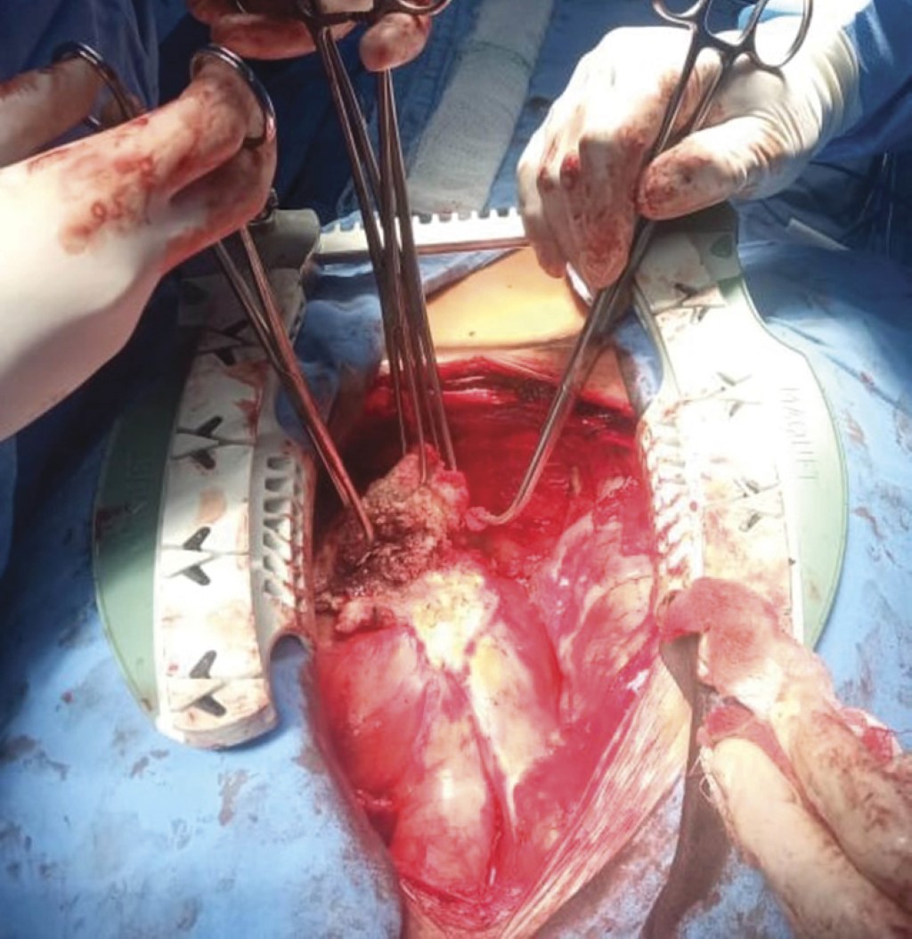 The patient was discussed in an internal committee at our hospital and accepted for pericardial tumor resection. A surgical procedure was scheduled with a median sternotomy approach, performing an interphrenic pericardiectomy without cardiopulmonary bypass. Findings included a thickened pericardium of 2 cm with severe calcification infiltrating the anterior wall of the right ventricle, pulmonary hilum, right atrium, and both venae cavae (Figure 2). There was a chronic-appearing hematoma of approximately 20 cc on the anterior wall of the right ventricle (Figure 3). There were no complications during the intervention, and the patient evolved favorably during his stay in intensive care.