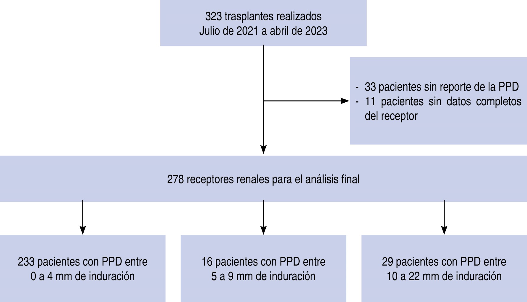 Material and methods: case-control study of patients with kidney transplants, who have a tuberculin skin test (PPD). Patients are grouped into those with PPD with induration of 0 to 5 mm, 6 to 10 mm and greater than 11 mm. SPSS version 26 was used.