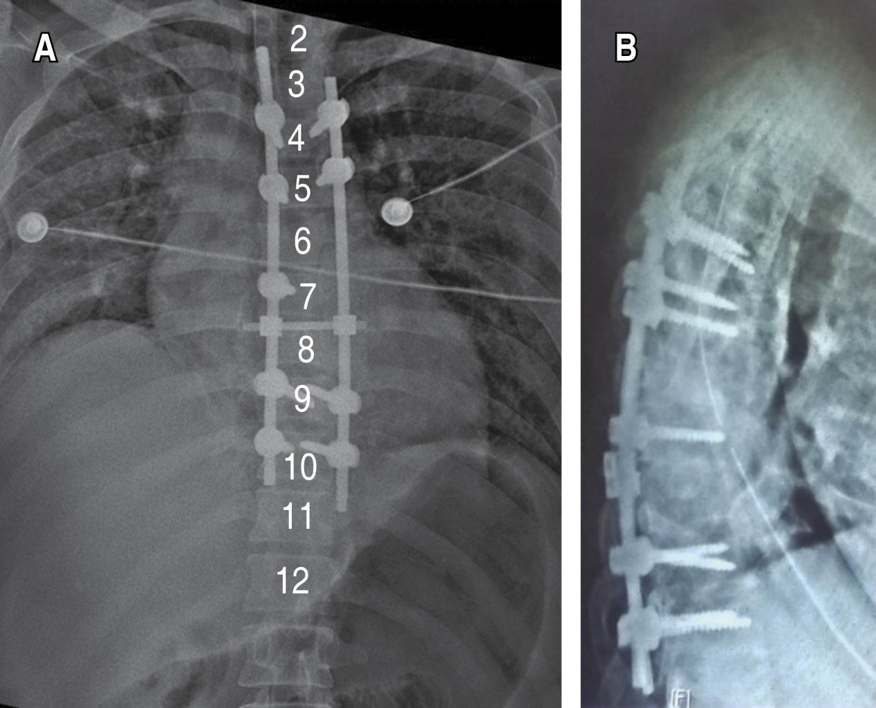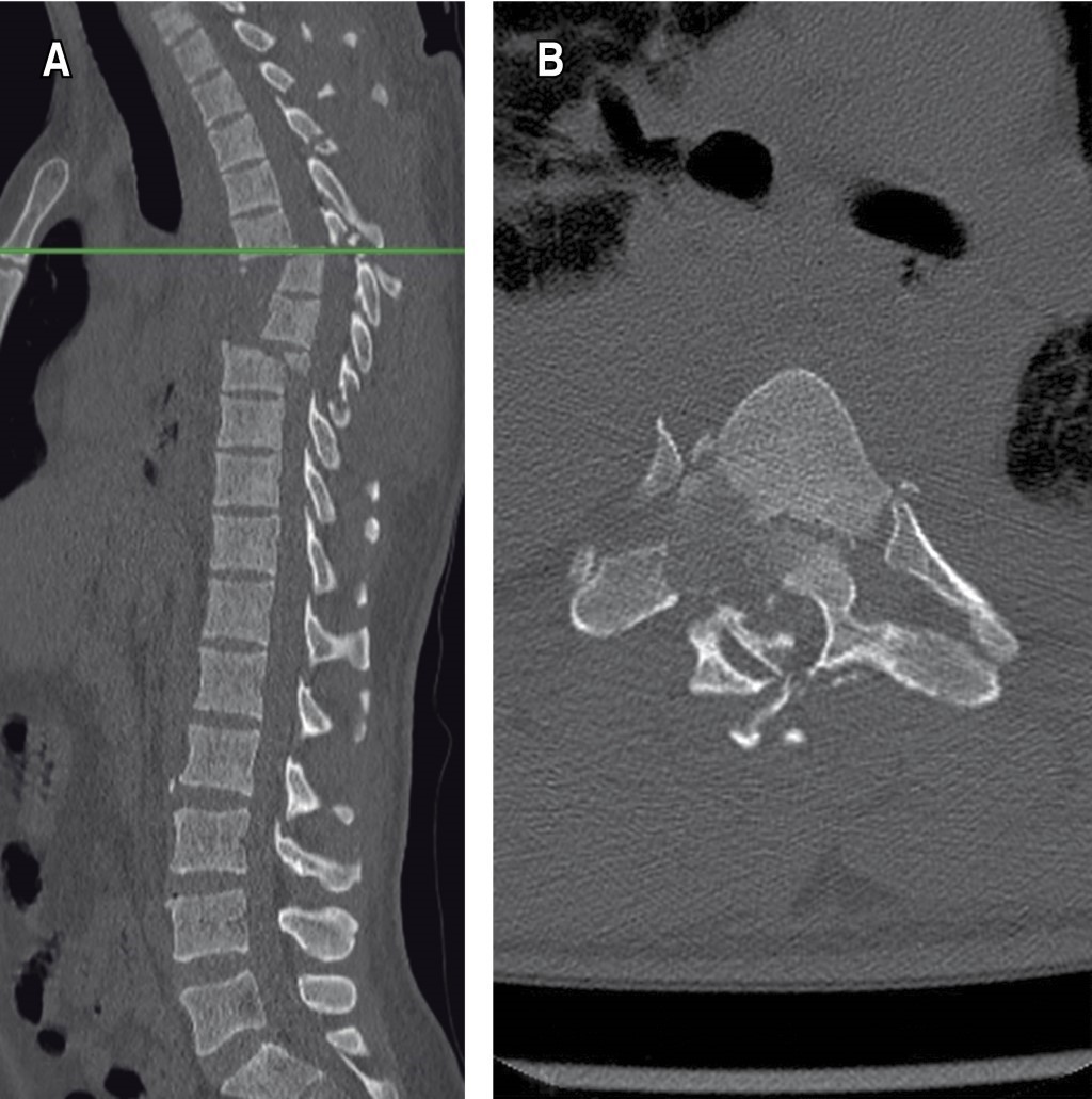 Case presentation: a 35-year-old male presented to the emergency department after having participated in a car accident. Neurological examination of the lower extremities revealed grade 0/0 muscle strength bilaterally with flaccid paralysis with absence of anal tone as well as a bulbocavernosus reflex, classifying the patient as ASIA A with a neurological level in T5. Fixation was performed via a posterior approach with laminectomy and instrumentation of two levels above and two below with a unilateral screw in the floating segment.