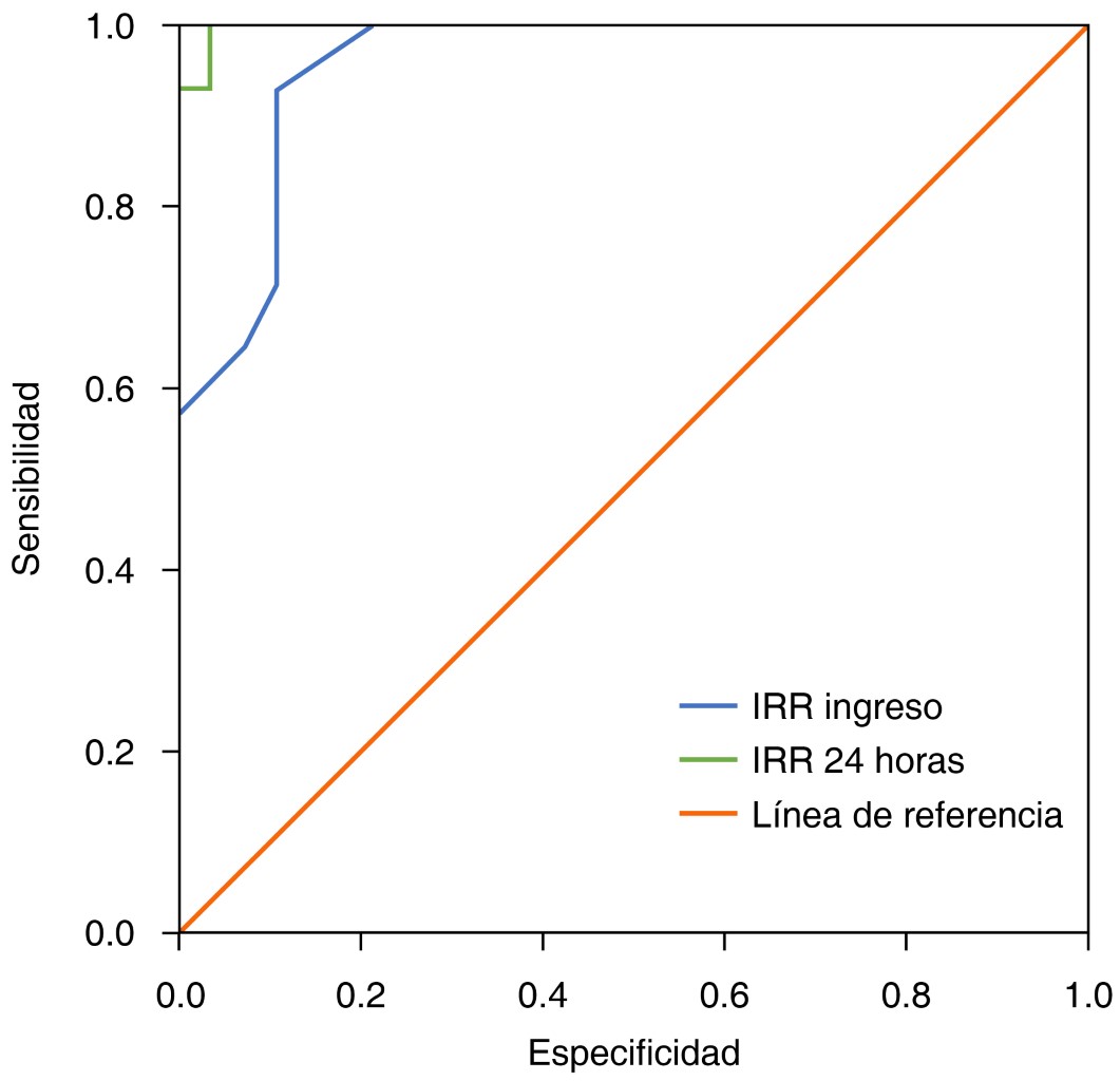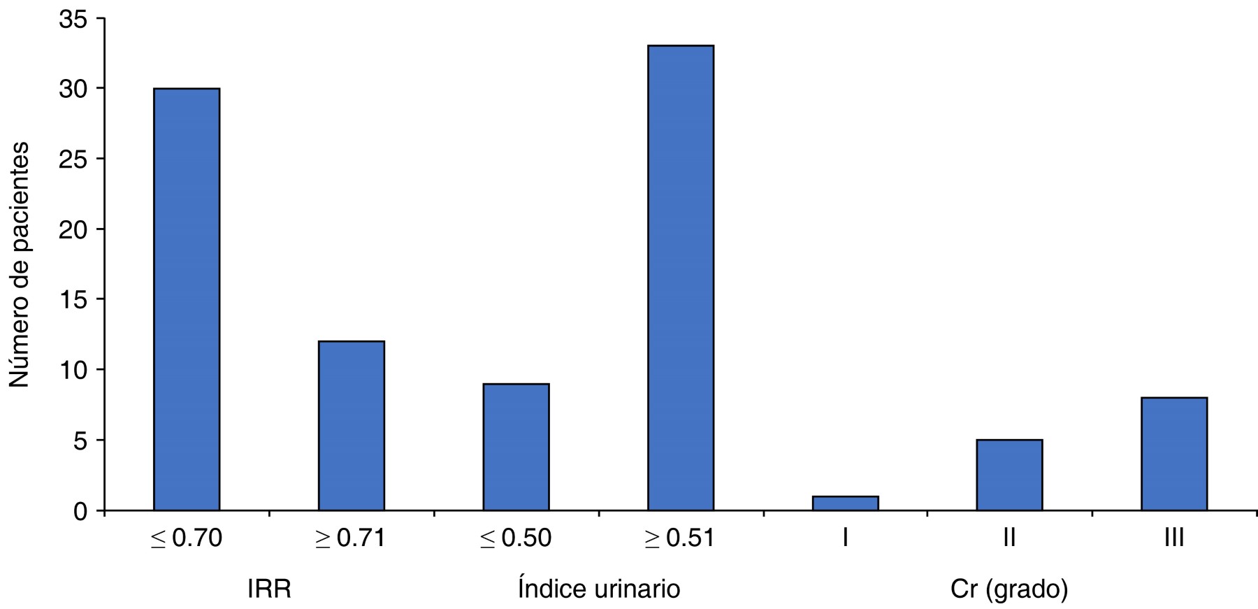Results: forty-two patients were analyzed: 37 (88.1%) men and five (11.9%) women. Traumatic etiology was the most frequent 71.4%. There was a significant association between RRI at admission (p = 0.0089), RRI at 24 hours (p = 0.026); values at admission showed an area under the curve (AUC) of 0.957 (p = 0.001); cut-off point of 0.64; with a sensitivity of 92.85% and specificity of 10.71%.